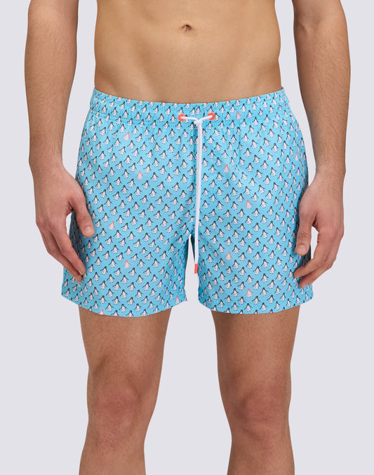 REPREVE® ELASTICATED WAIST SHORT SWIMSHORTS WITH PENGUINS PRINT