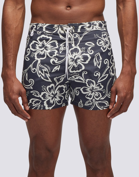 SHORT FIXED WAIST SWIMSHORTS ICONIC TAFFETA WITH VINTAGE PRINT HIBISCUS SK23