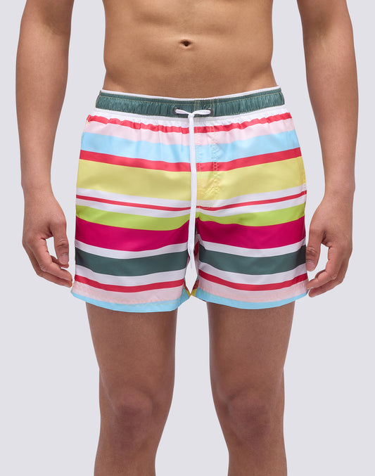 BAÑADOR CORTO DE CINTURA ELÁSTICA CON ESTAMPADO DE RAYAS MULTICOLORES
