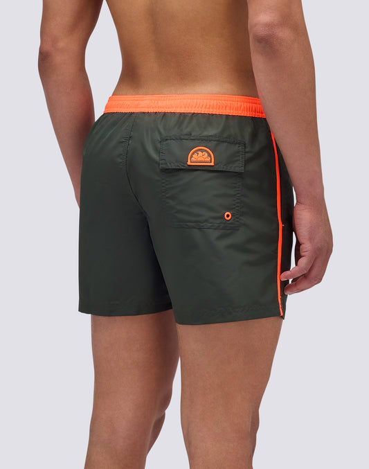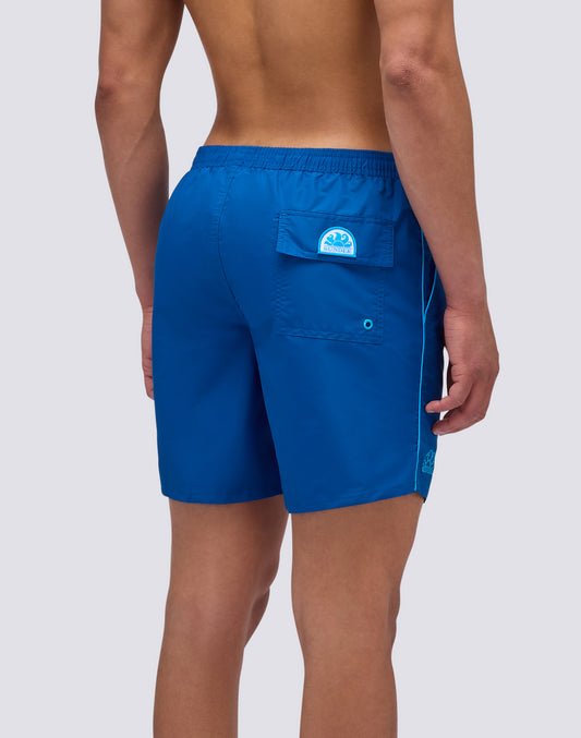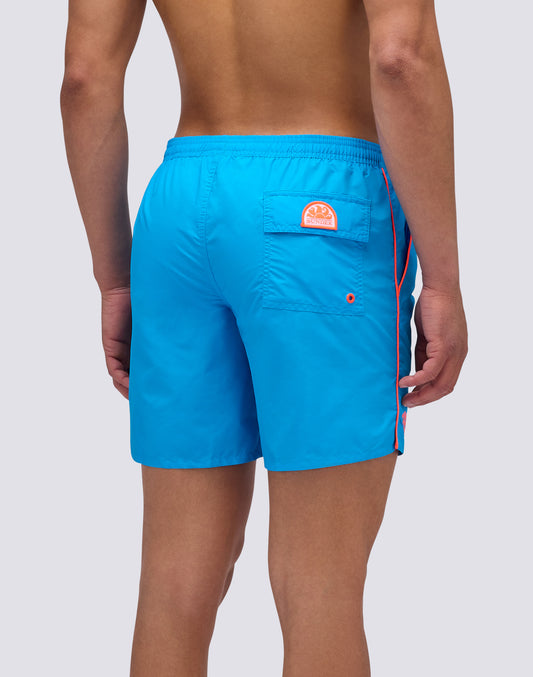 ICÓNICO BAÑADOR CORTO DE TAFETÁN CON CINTURA ELÁSTICA Y RIBETES EN CONTRASTE