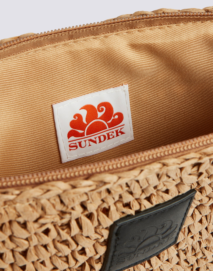 Minibolso de papel efecto paja con asa de mano y cierre de cremallera. Los colores contrastados de los detalles le dan vida. Su pequeño tamaño lo hace perfecto para llevar tus imprescindibles.