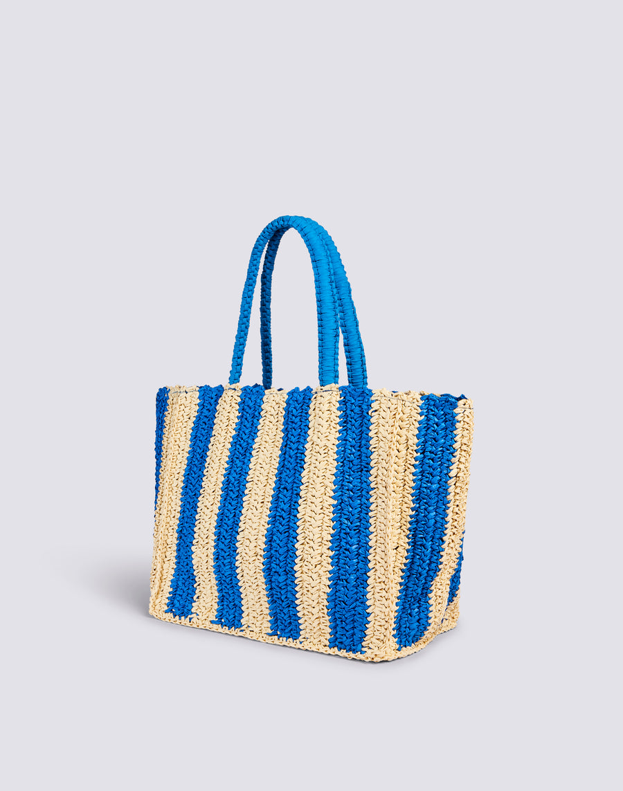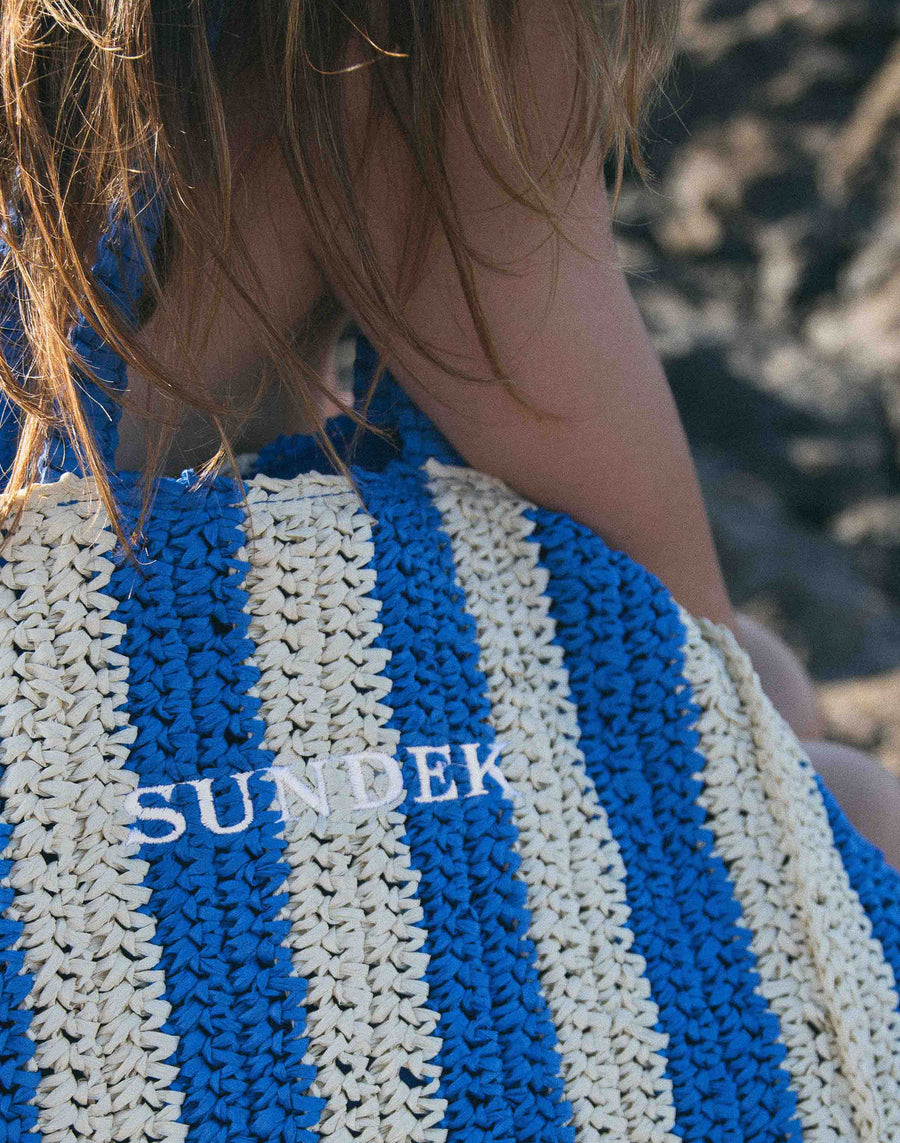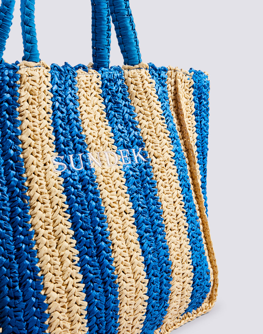 Bolsa Paper Straw a rayas con asas, cierre de cremallera y logotipo de Sundek bordado. Ideal para la playa, para llevar todo lo necesario para un día de playa.