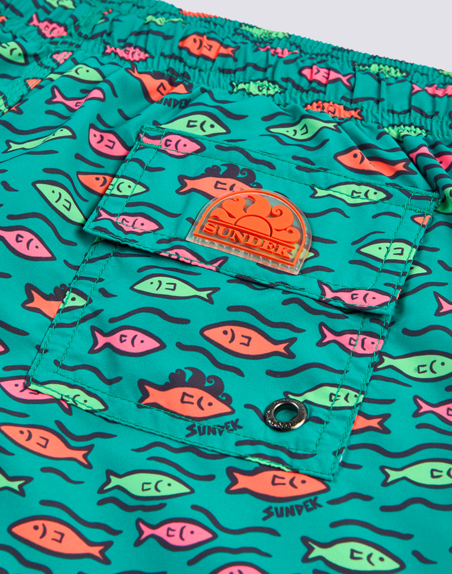 BAÑADOR CORTO CON ELÁSTICO EN LA CINTURA Y ESTAMPADO DE BOLAS DE PESCA EN POLIÉSTER RECICLADO