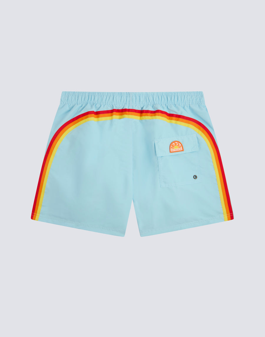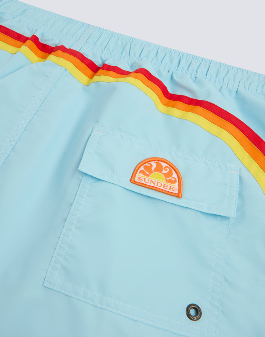 Pantalones cortos de mar para hombre con cintura elástica, cordón y el icónico arcoíris de Sundek en la espalda. Este traje de baño está hecho con costuras de tres agujas y 100% de nuestro tejido heritage, nylon-tafetán: suave como la seda, ligero y resistente a todo, se seca muy rápido para brindarte comodidad en todas partes, en las olas y fuera del agua. Longitud 35 cm (tamaño M), medido en el lado externo de la pierna.