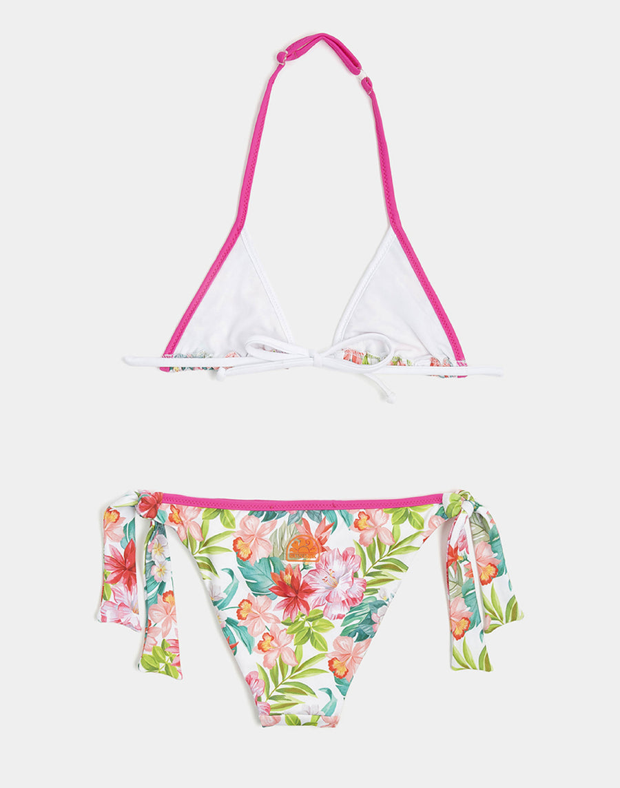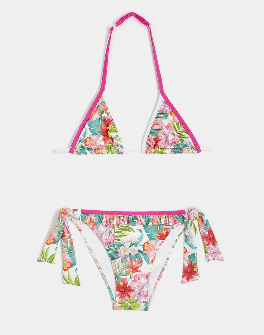Colores brillantes e impresión fiorita de inspiración hawaiana para este bikini cuando era niño. Cubra con cordones y calzoncillos ajustables con copos ajustables en los lados.