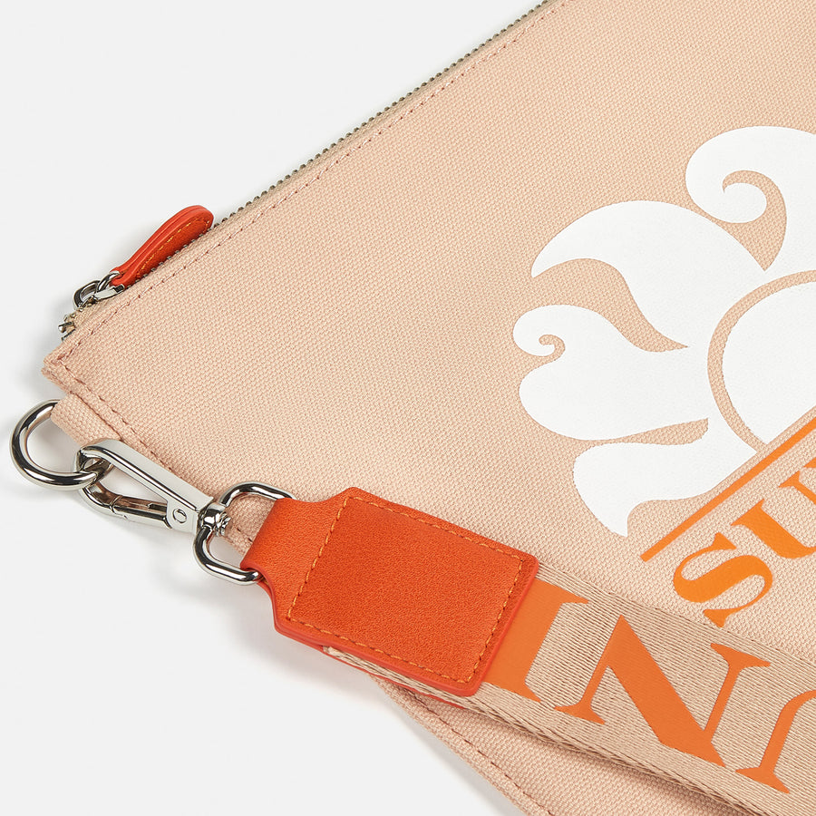 Clutch de lona con logotipo sundek estampado, perfecto tanto como neceser como para llevar como clutch atado a la muñeca. Correa con logotipo extraíble.