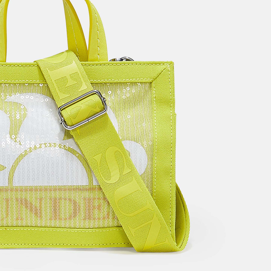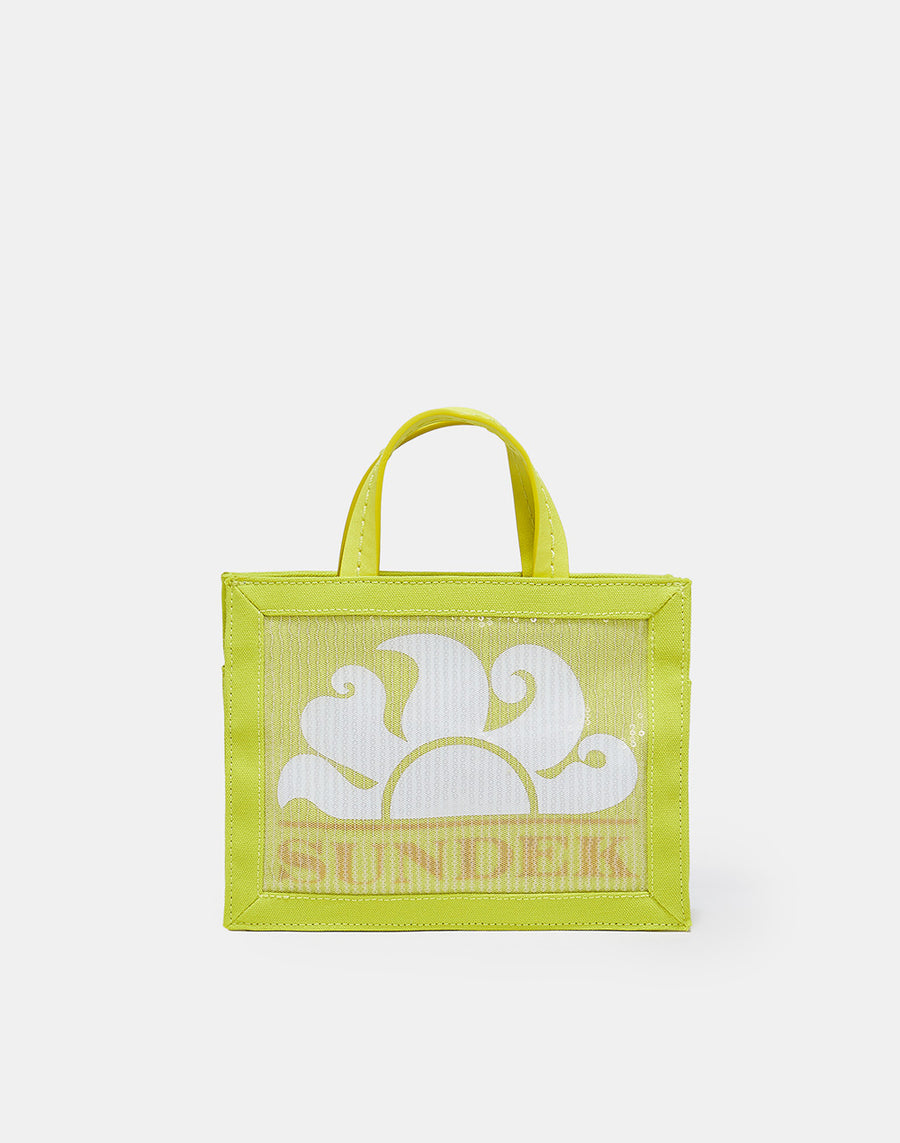 Bolso pequeño de malla con detalles de lentejuelas con logotipo Sundek estampado. Esta bolsa es perfecta para la playa gracias a su malla de tejido fino que evita el paso de la arena.