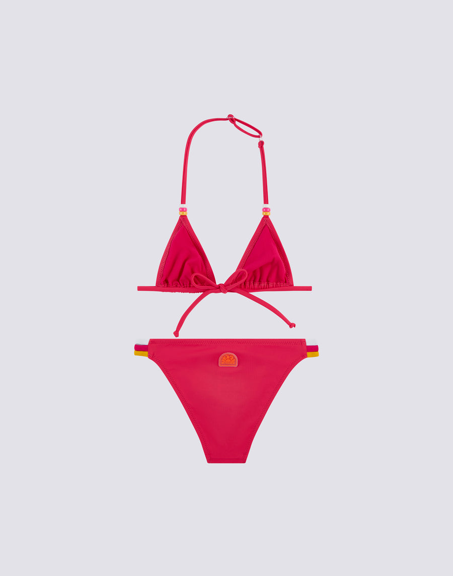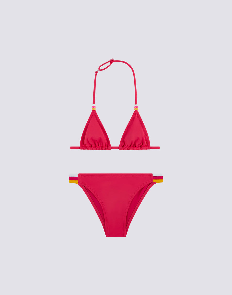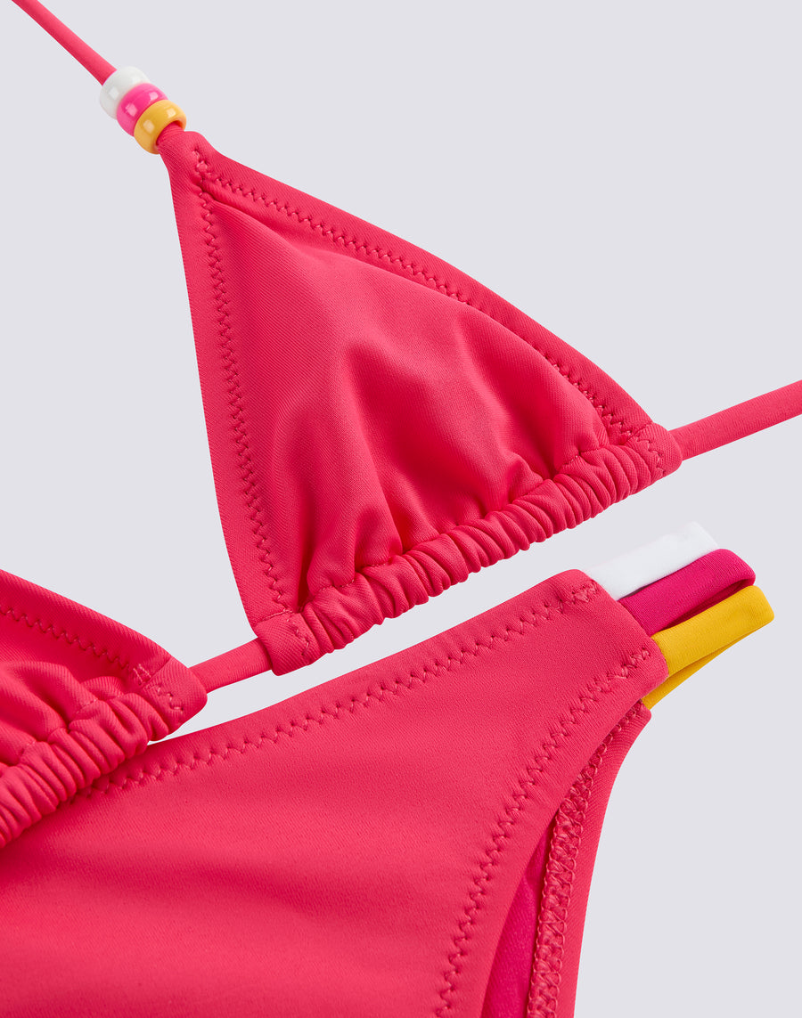 Bikini de baño para niña con parte de arriba de triángulo ajustable con lazos en la nuca adornados con abalorios tricolores. Los tres colores de las cuentas se repiten en el detalle tricolor del lateral de la braguita del bikini. El traje de baño de dos piezas está confeccionado con tejido VITA de Carvico, que es cómodo, resistente y no teme al cloro ni a las cremas solares.