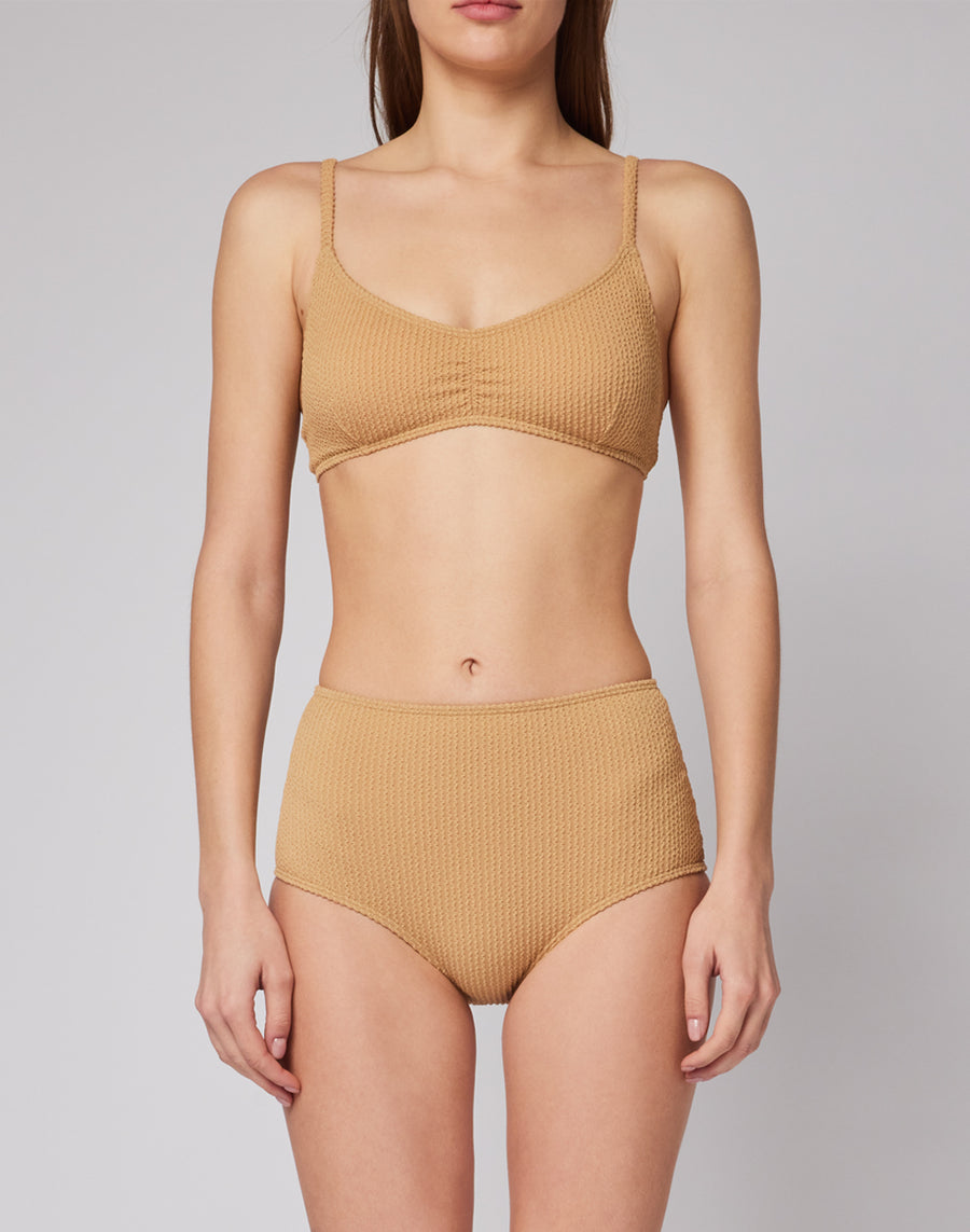Braguita de cintura alta en tejido fruncido double ligero y cómodo. Combínala con el top con aros y copas preformadas para un conjunto refinado.