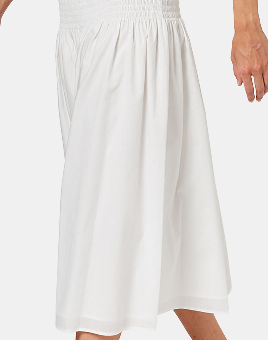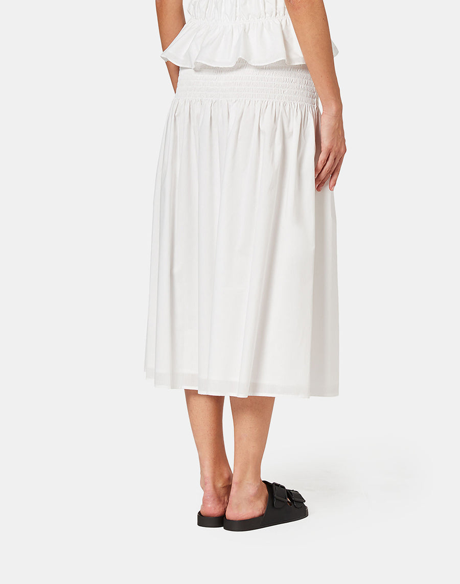 Falda larga con bordado elástico de punto smock en la cintura y volante fruncido. Perfecta para muchas ocasiones, es imprescindible para aquellas que no renuncian a una falda larga y holgada en verano que sea fácil de llevar y de combinar.