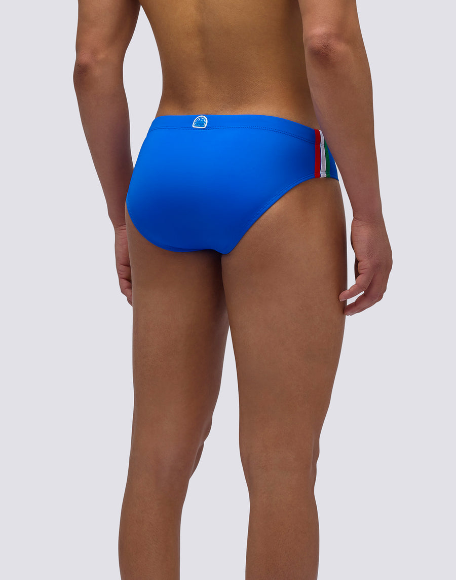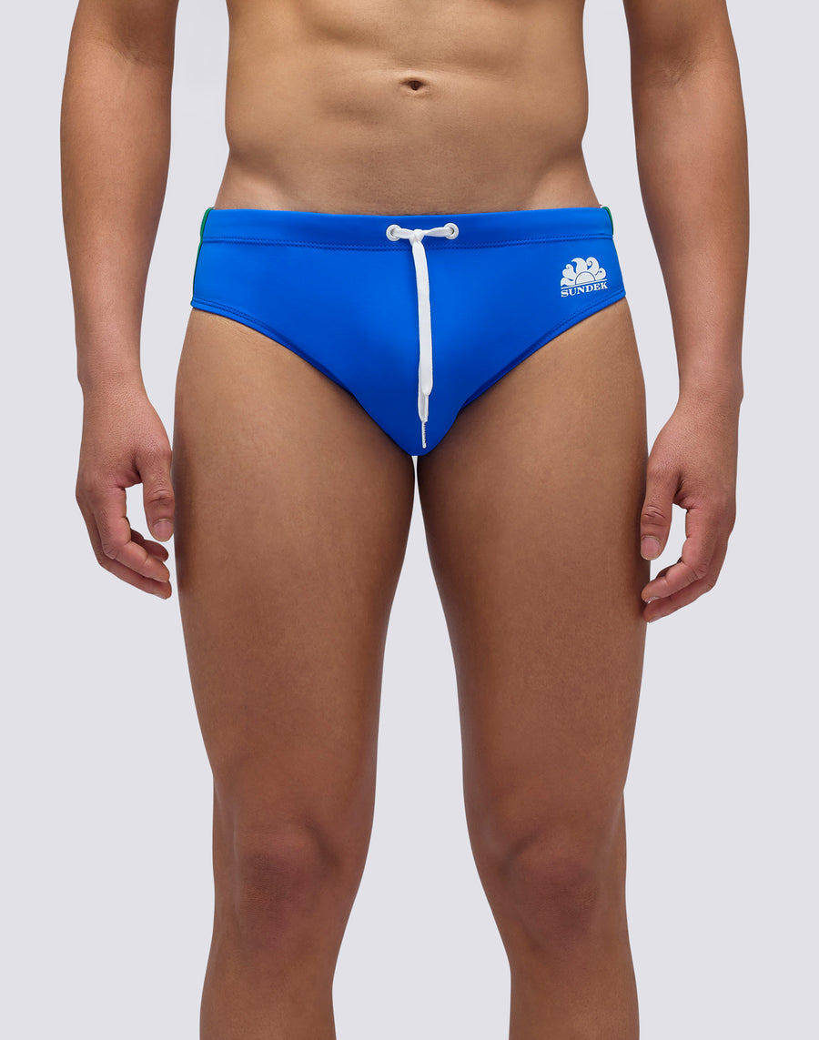 Braguita de hombre en color liso y cintura ajustable. Bañador monocromático con cordón y tres bandas laterales de colores en contraste para un look decidido y funcional. Se seca rápidamente y te aporta comodidad y resistencia dentro y fuera del agua: úsalo para nadar y entrenar y cuando descanses y tomes el sol.