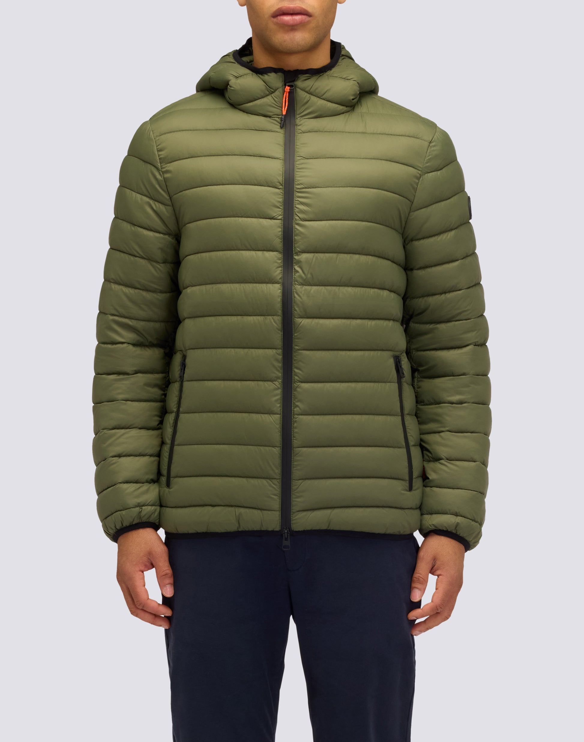 Chaqueta corta para hombre con capucha, confeccionada en tejido de nailon opaco superligero acolchado con canales horizontales y con relleno interior de fibra sintética de poliéster reciclado Repreve. Prenda dotada de numerosos detalles técnicos que la convierten en una chaqueta funcional y práctica. Corte regular, grado de calor medio.