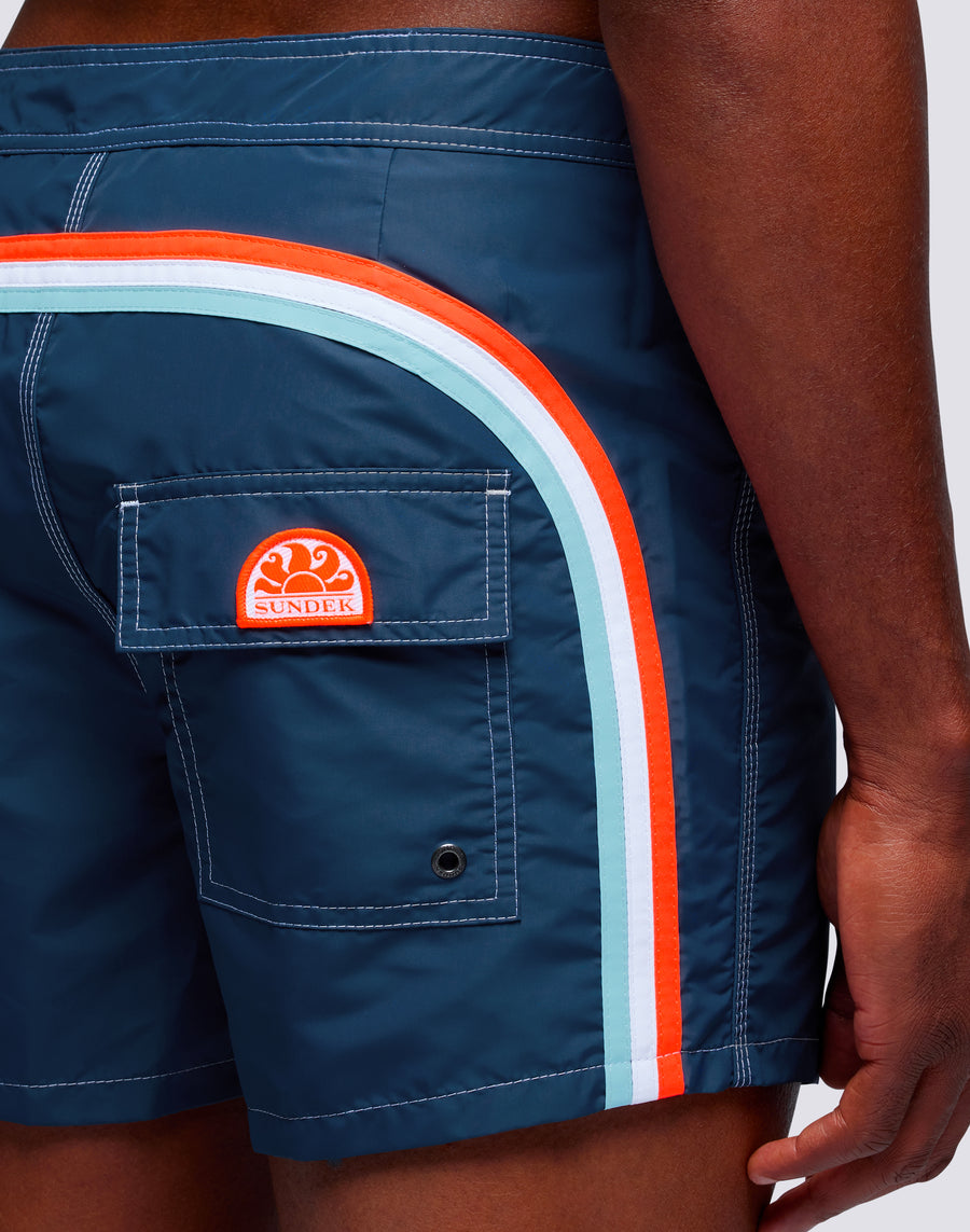 Energía vibrante, color intenso y el icónico arcoíris de Sundek que se asoma en este calzoncillo bóxer para hombre. Está confeccionado en nuestro histórico tejido de tafetán de nailon, con un tacto sedoso, cómodo y de secado rápido, mientras que el pespunte a tres agujas lo hace resistente día tras día. Longitud 35 cm (tamaño M), medido en el lado externo de la pierna.
