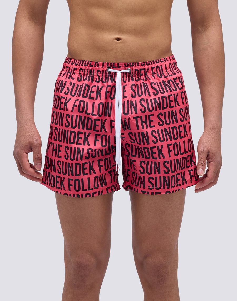 Bañador tipo short para hombre confeccionado en tejido de poliéster ligero y de secado rápido. Detalle icónico del arcoíris Sundek en la parte trasera y estampado. Longitud exterior del muslo: 14"/35 cm (en talla M).