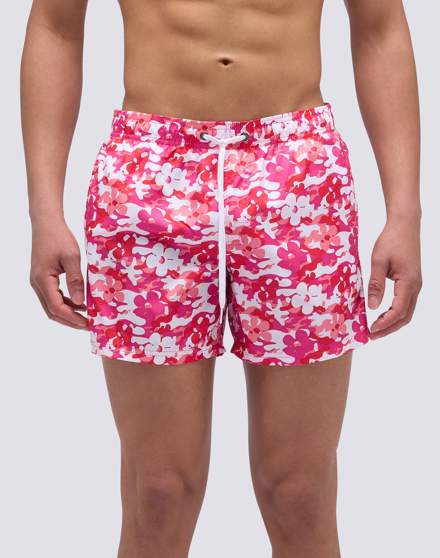 Bañador tipo short para hombre confeccionado en tejido de poliéster ligero y de secado rápido. Detalle icónico del arcoíris Sundek en la parte trasera y estampado. Longitud exterior del muslo: 35 cm (talla M).