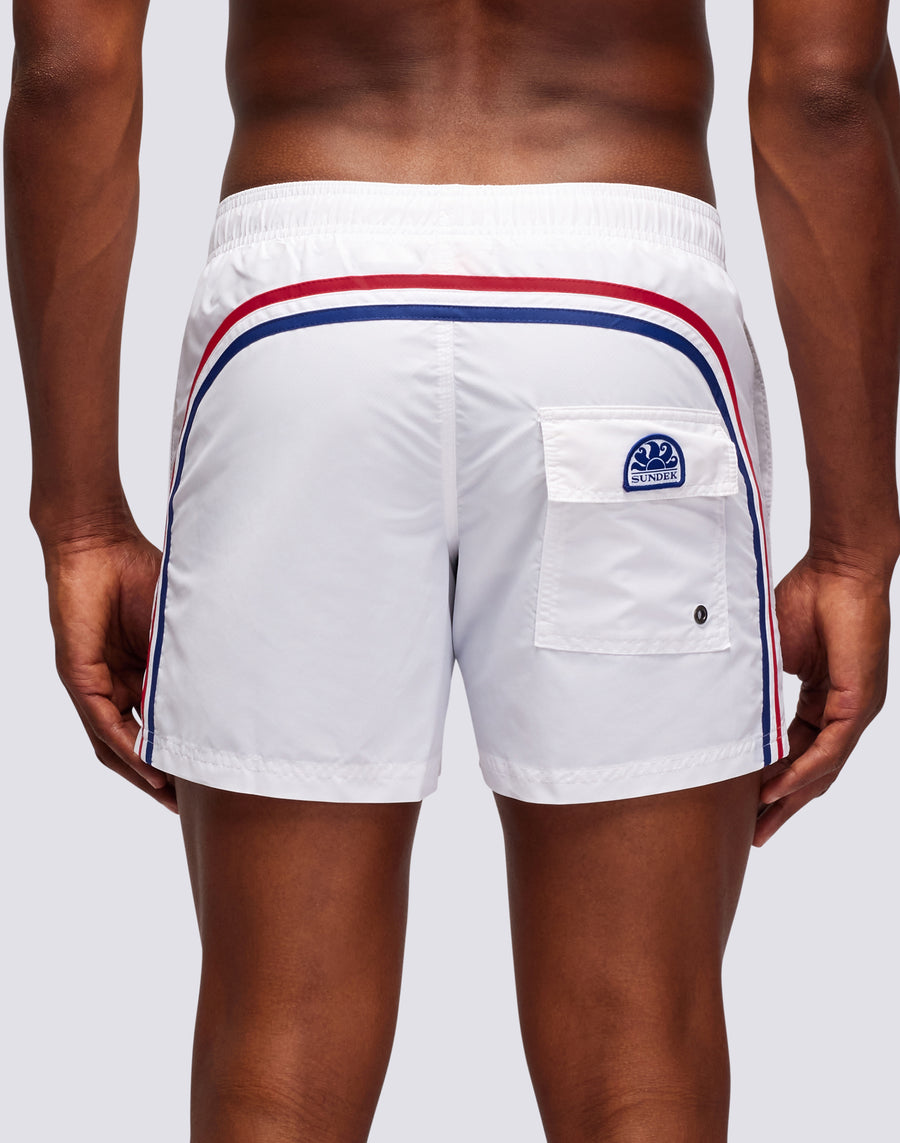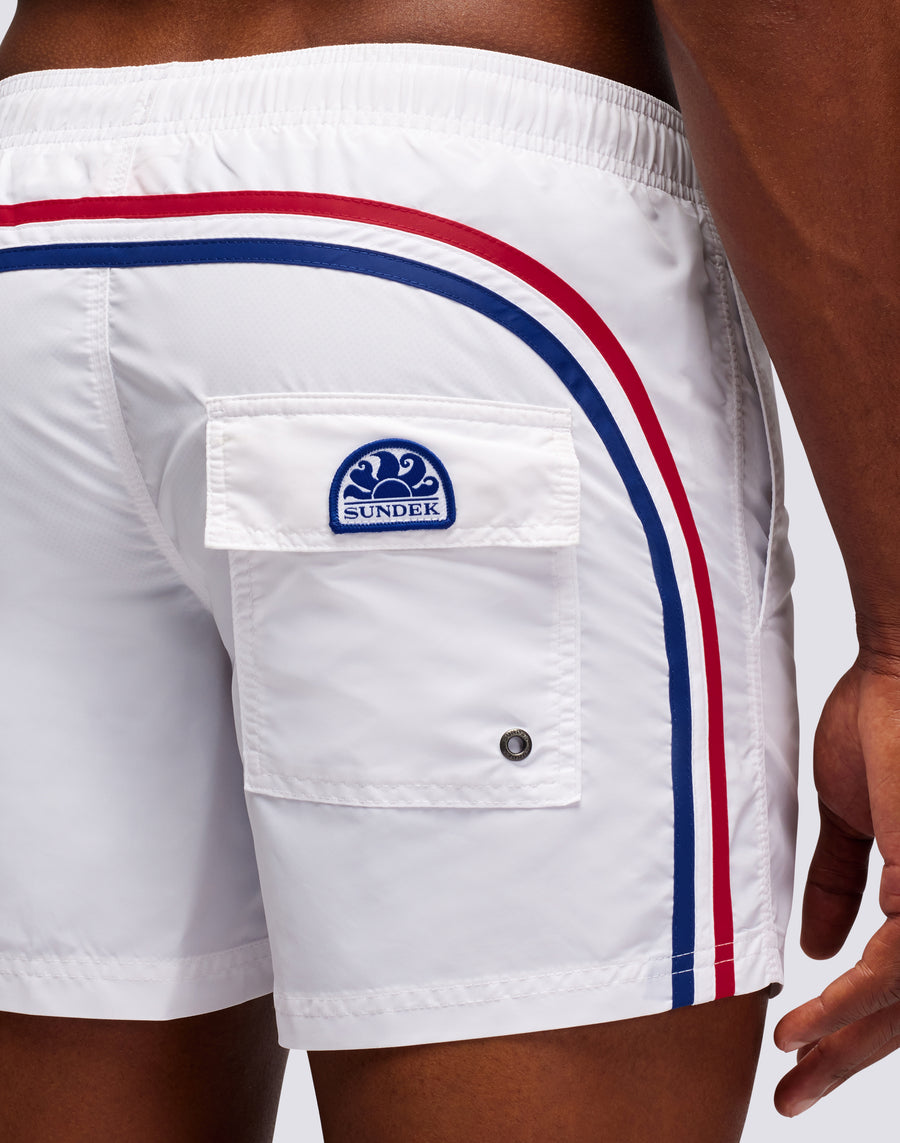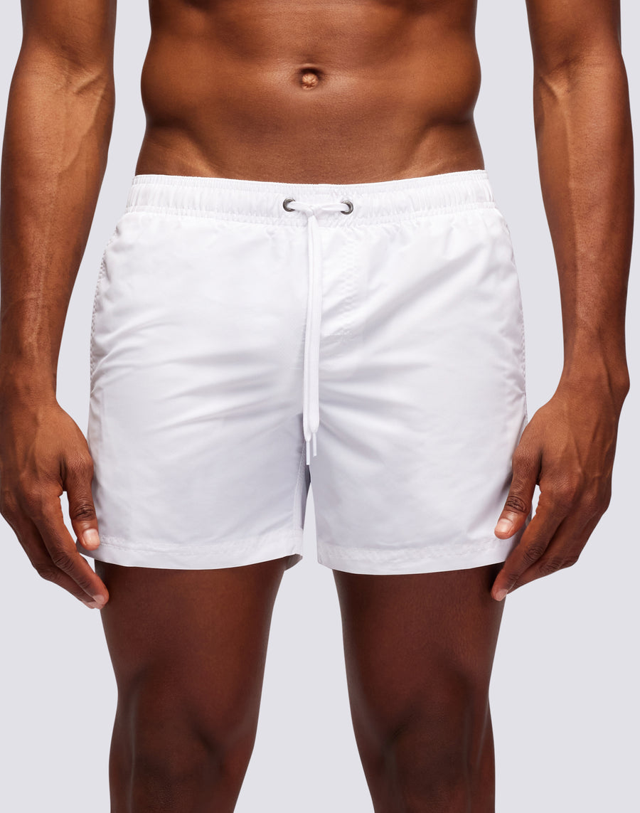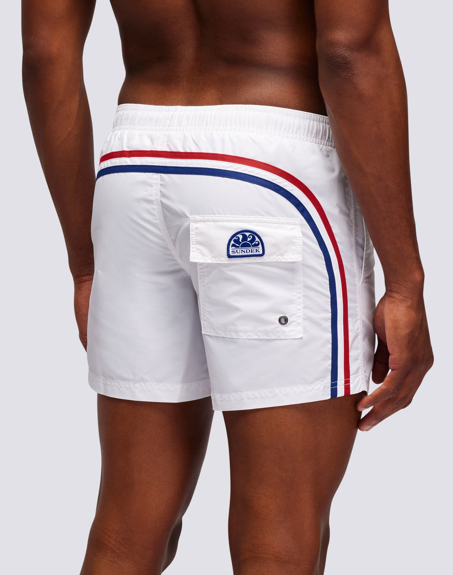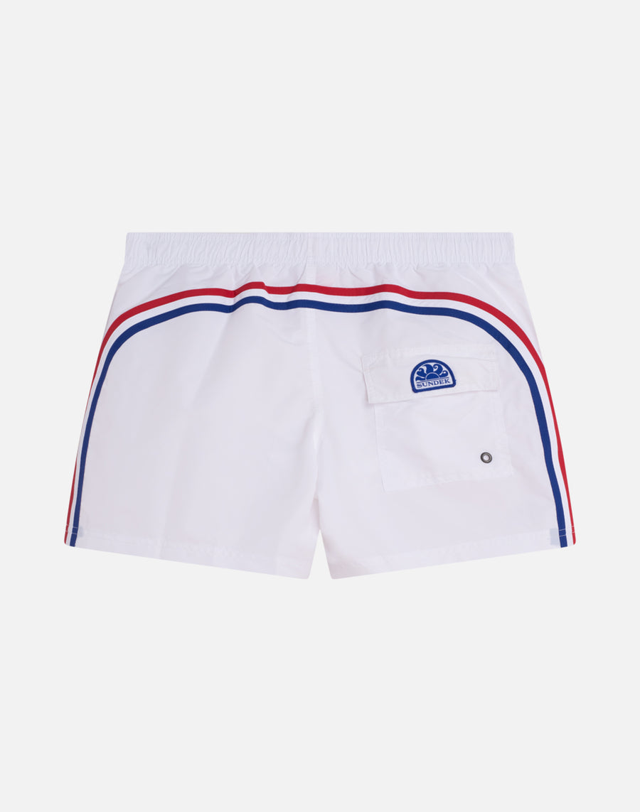 | Bañador con cintura elástica con cordón, confeccionado en el emblemático tejido tafetán de secado rápido. Triple costura en las zonas de tensión para una máxima resistencia. Detalle icónico del arco iris en la espalda. Largo de la cintura 14"/35 cm (talla m). |