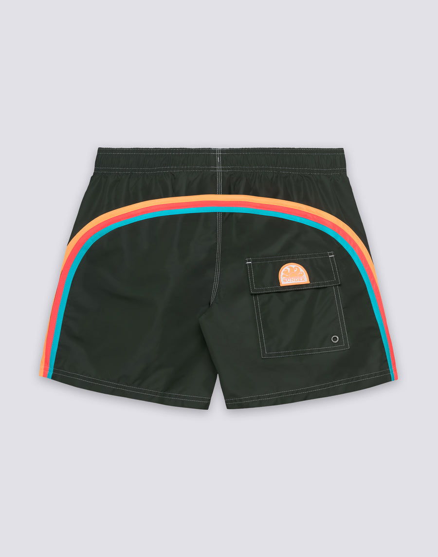 Pantalones cortos de mar para hombre con cintura elástica, cordón y el icónico arcoíris de Sundek en la espalda. Este traje de baño está hecho con costuras de tres agujas y 100% de nuestro tejido heritage, nylon-tafetán: suave como la seda, ligero y resistente a todo, se seca muy rápido para brindarte comodidad en todas partes, en las olas y fuera del agua. Longitud 35 cm (tamaño M), medido en el lado externo de la pierna.