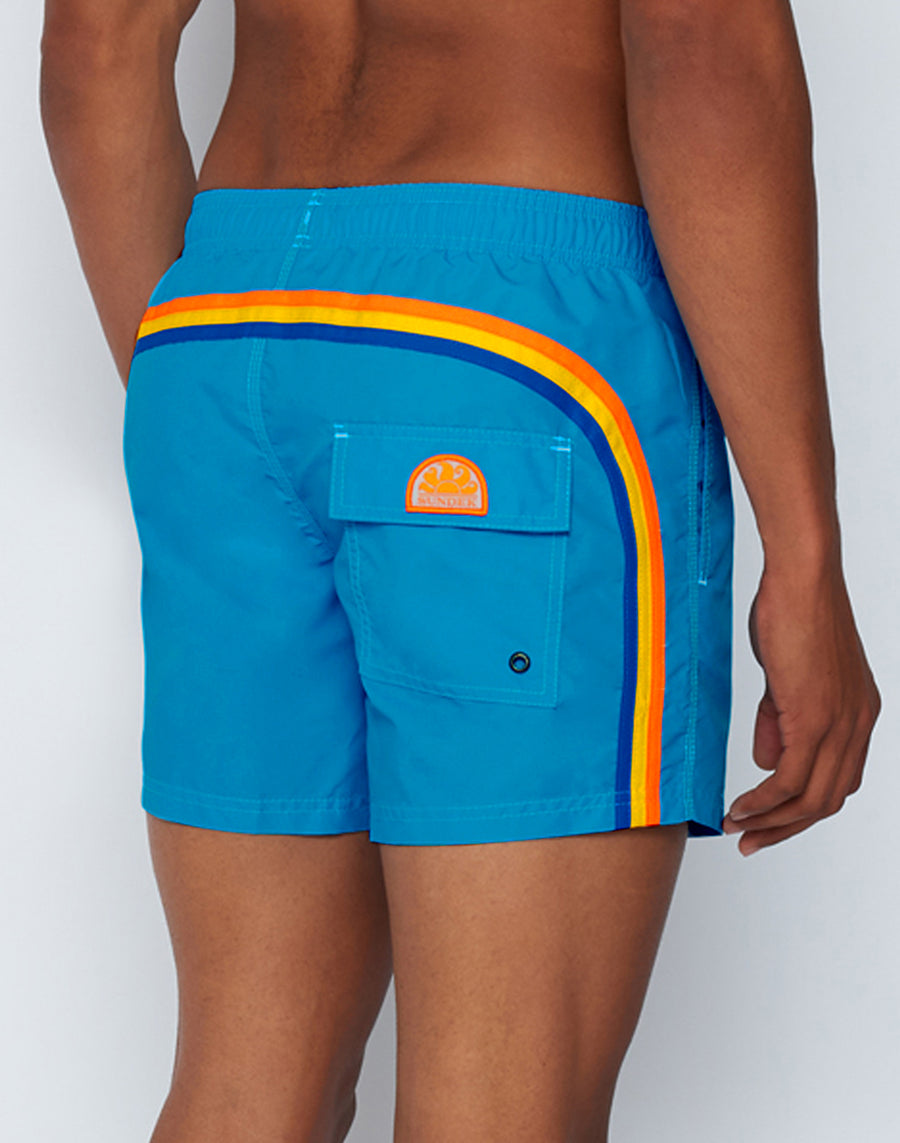 Pantalones cortos de mar para hombre con cintura elástica, cordón y el icónico arcoíris de Sundek en la espalda. Este traje de baño está hecho con costuras de tres agujas y 100% de nuestro tejido heritage, nylon-tafetán: suave como la seda, ligero y resistente a todo, se seca muy rápido para brindarte comodidad en todas partes, en las olas y fuera del agua. Longitud 35 cm (tamaño M), medido en el lado externo de la pierna.