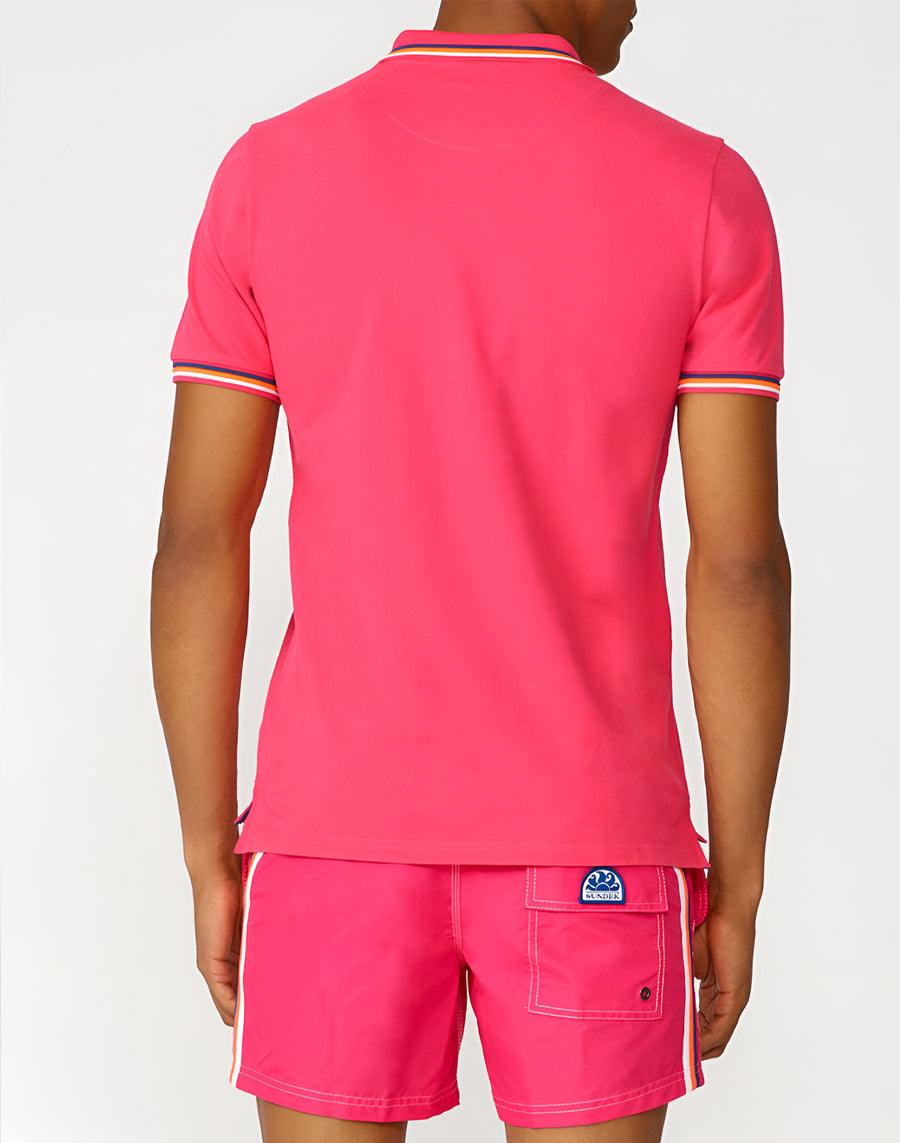 El polo de hombre tiene que ver con los detalles con el cuello y los puños detallados con el icónicas bandas tricolores, la firma de Sundek. Perfecta para combinar con vaqueros, pantalones casual y bermudas, dando un toque de personalidad a los outfits.