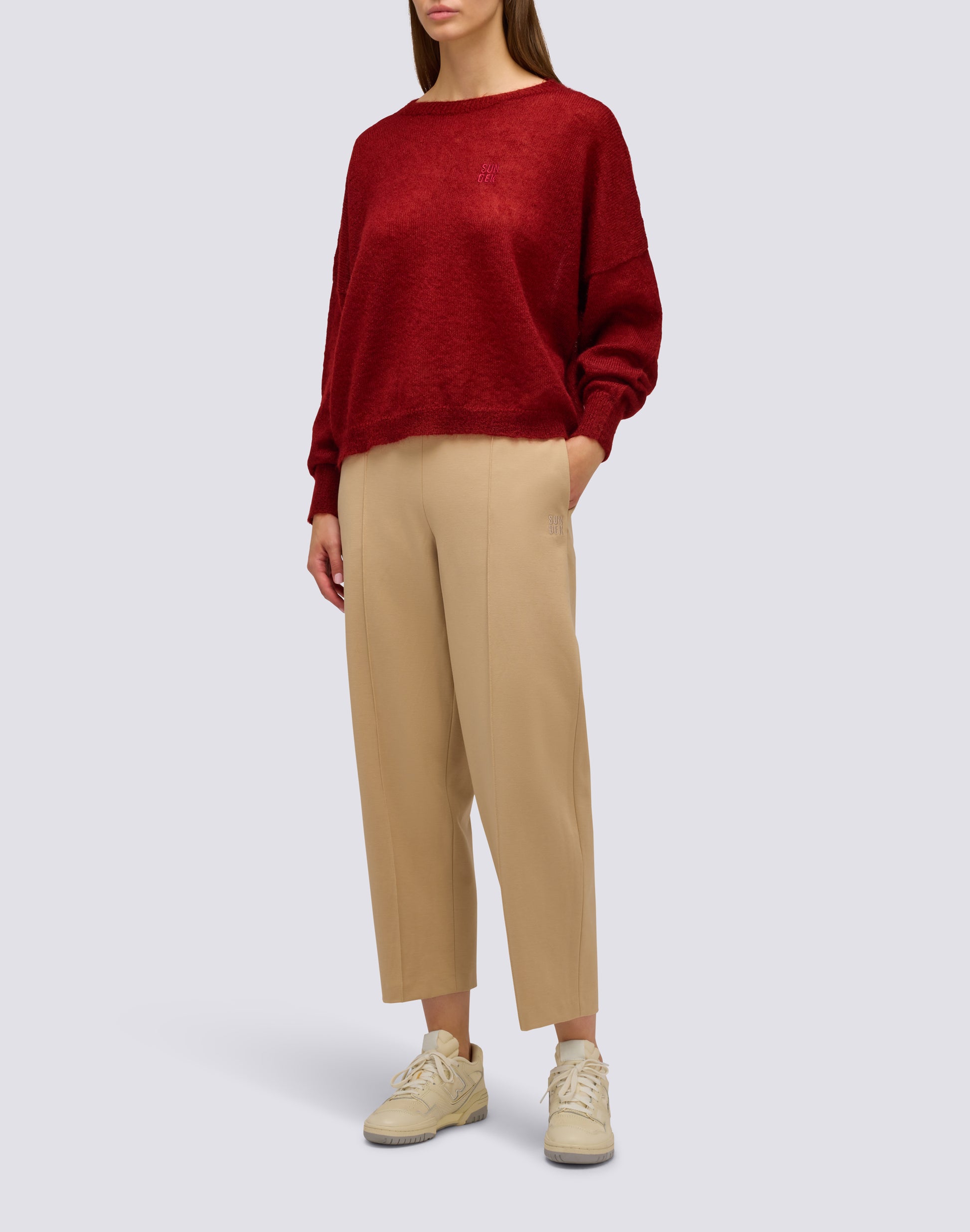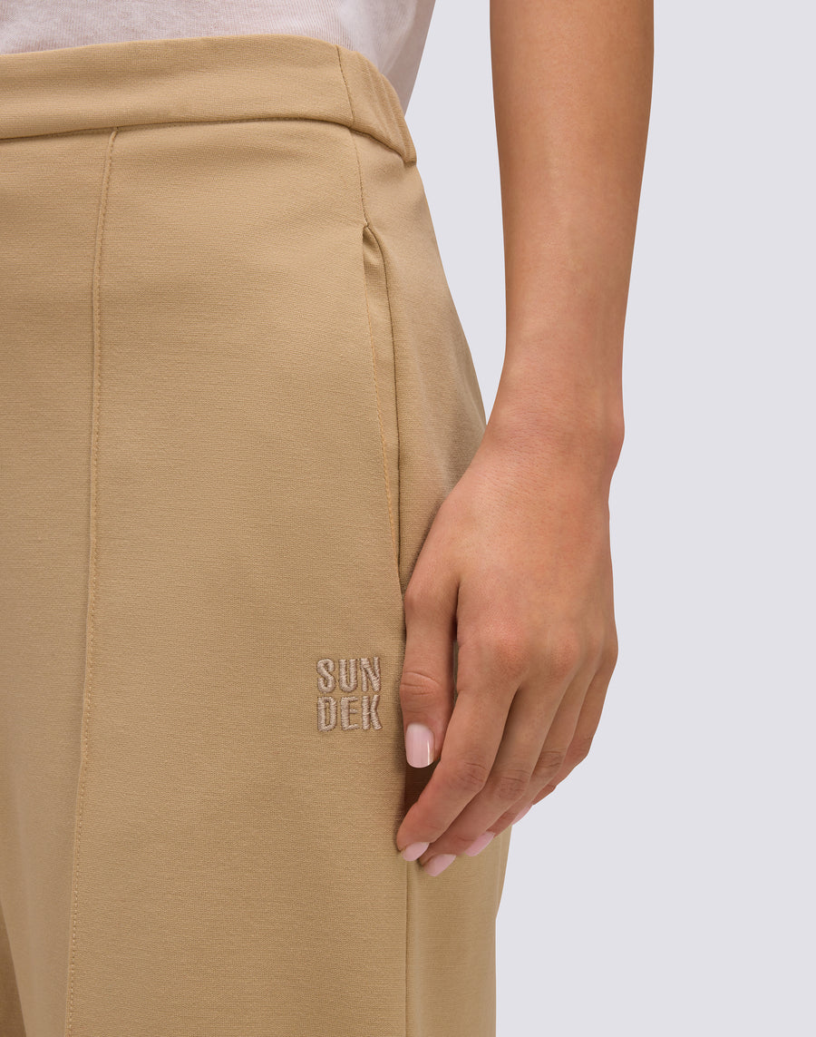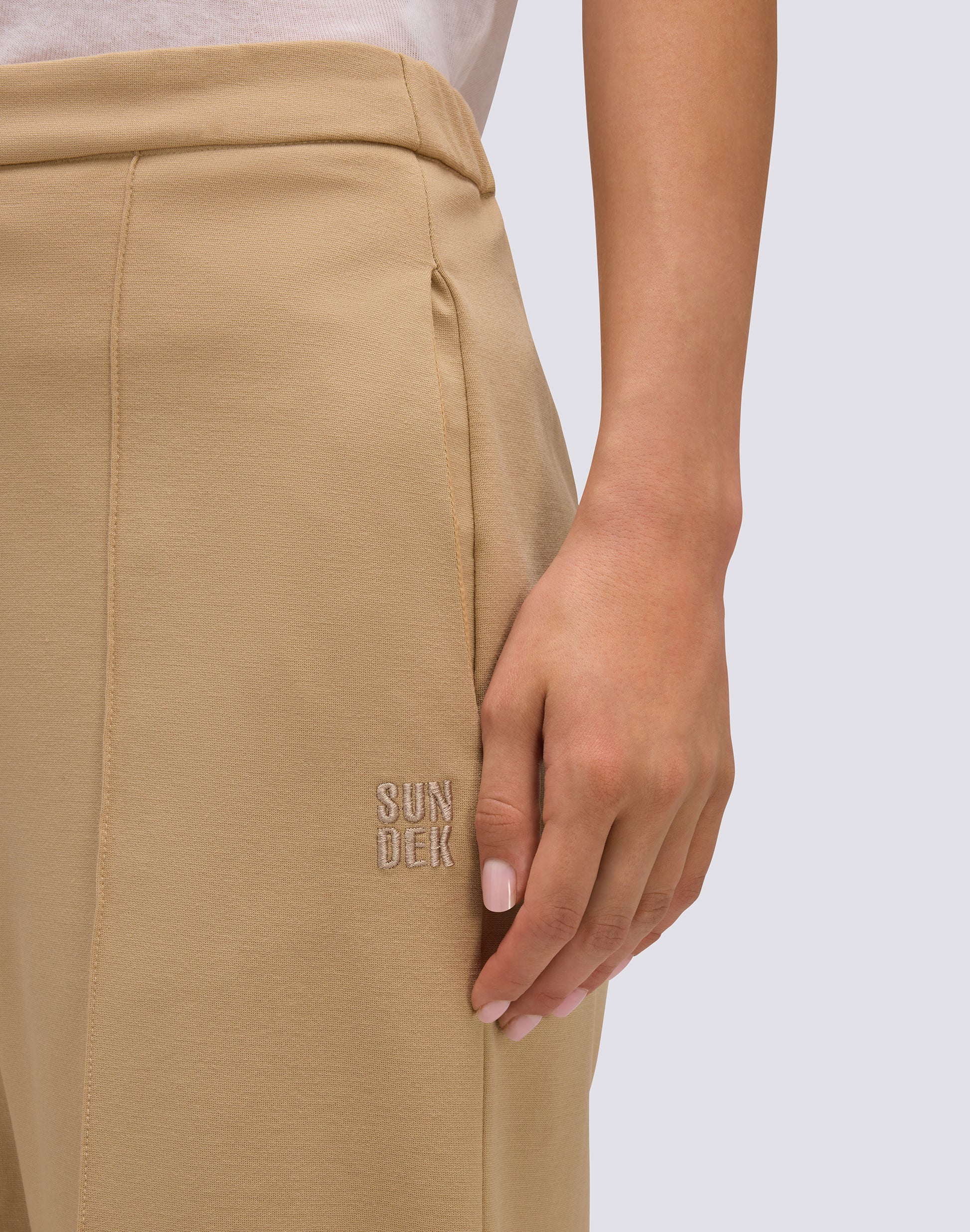 Pantalones largos de mujer en punto Milano con cintura semi elástica, pinza central delantera y bolsillos laterales. Suaves, corte holgado.