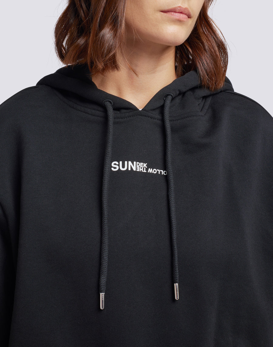 Carácter informal y relajado para esta sudadera de mujer con capucha y logotipo estampado en la parte delantera.