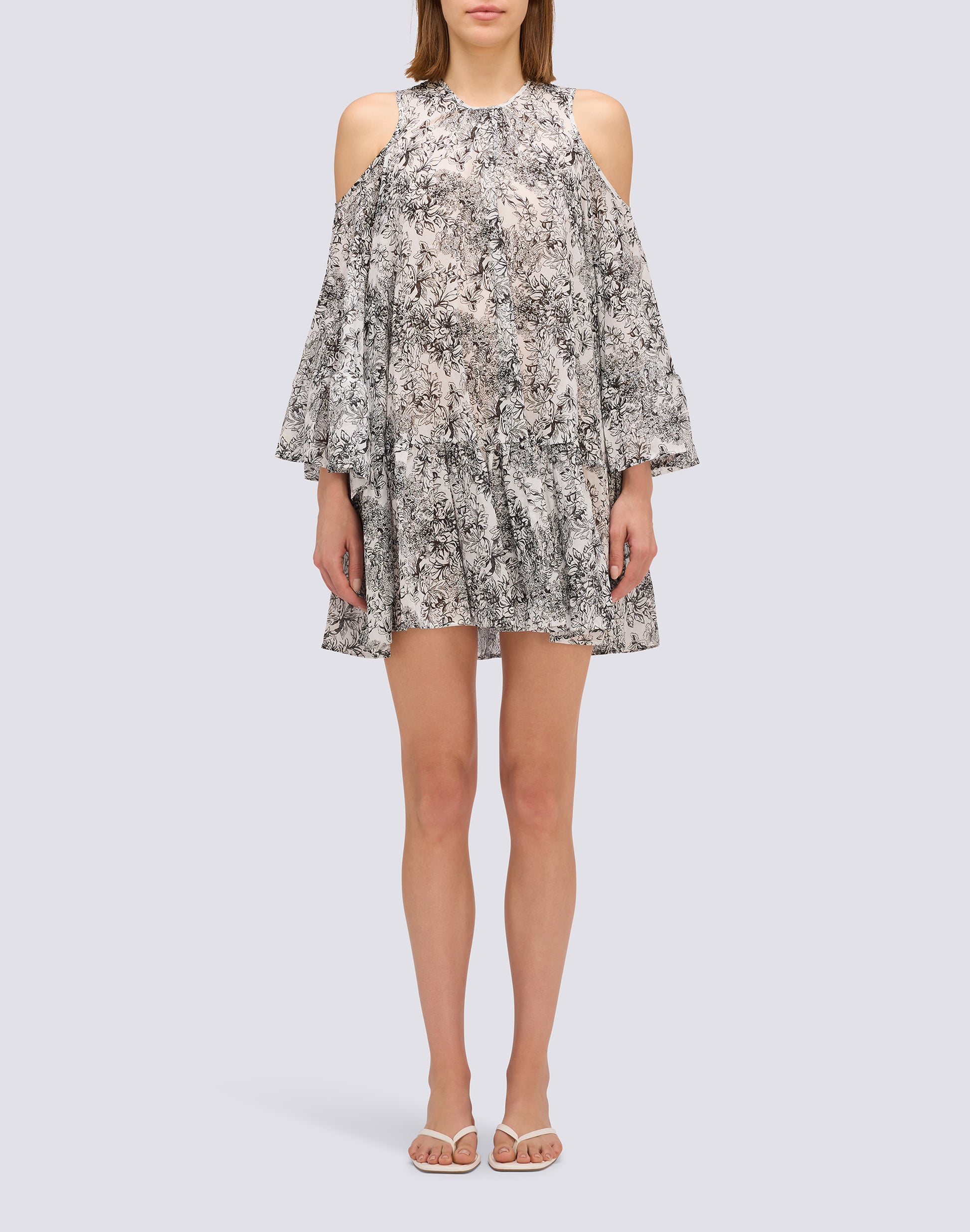 Elegante vestido corto con estampado Fleur de Joie, mangas largas y hombros descubiertos. Ideal para disfrutar de tus veladas de verano o para tomar un aperitivo en la playa al atardecer.