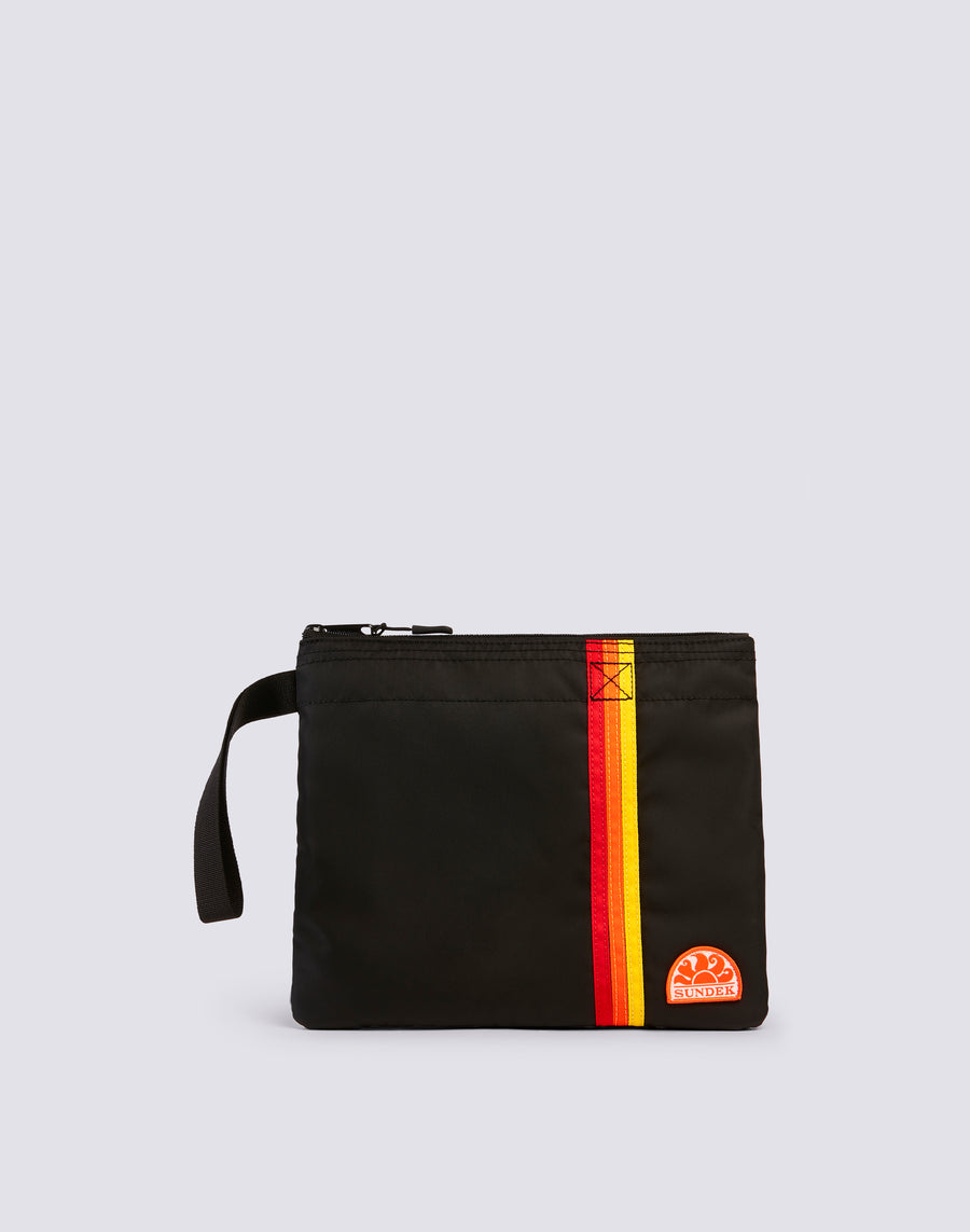 Pochette de plage légère et doublée avec le détail emblématique des rubans tricolores pour ranger et protéger les objets essentiels que tu choisis d'avoir à portée de main. Idéale pour emporter dans ton sac ou toute seule grâce à sa dragonne pratique.