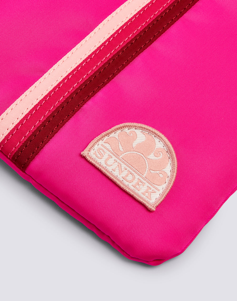 Pochette de plage légère et doublée avec le ruban tricolore emblématique pour ranger et protéger les essentiels que vous préférez garder à portée de main. Parfait à transporter dans votre sac ou seul grâce à la dragonne pratique.