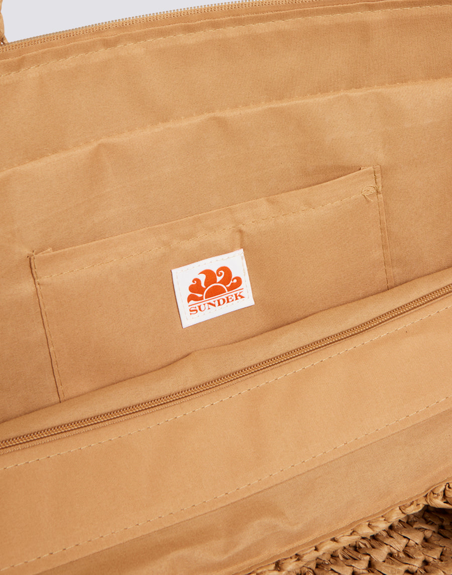 Maxi sac en paille de papier tressée avec fermeture zippée centrale et anse. Design spacieux et original.