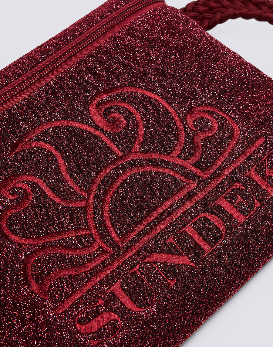 Pochette en lurex avec poignée en corde sur le côté. Scintillante, à associer à vos tenues les plus tendance comme pochette pour vos essentiels.