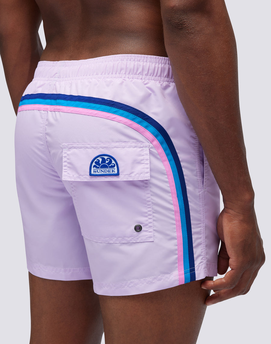 Short de bain court pour homme avec taille élastiquée, cordon de serrage et arc-en-ciel emblématique Sundek dans le dos. Ce maillot de bain est réalisé avec des coutures à trois aiguilles et 100% de notre tissu historique, le nylon-taffetas : doux comme de la soie, léger et résistant à tout, il sèche très rapidement pour vous offrir un confort partout, dans les vagues et en dehors des cascades. Longueur 35 cm (taille M), mesurée à l'extérieur de la jambe.