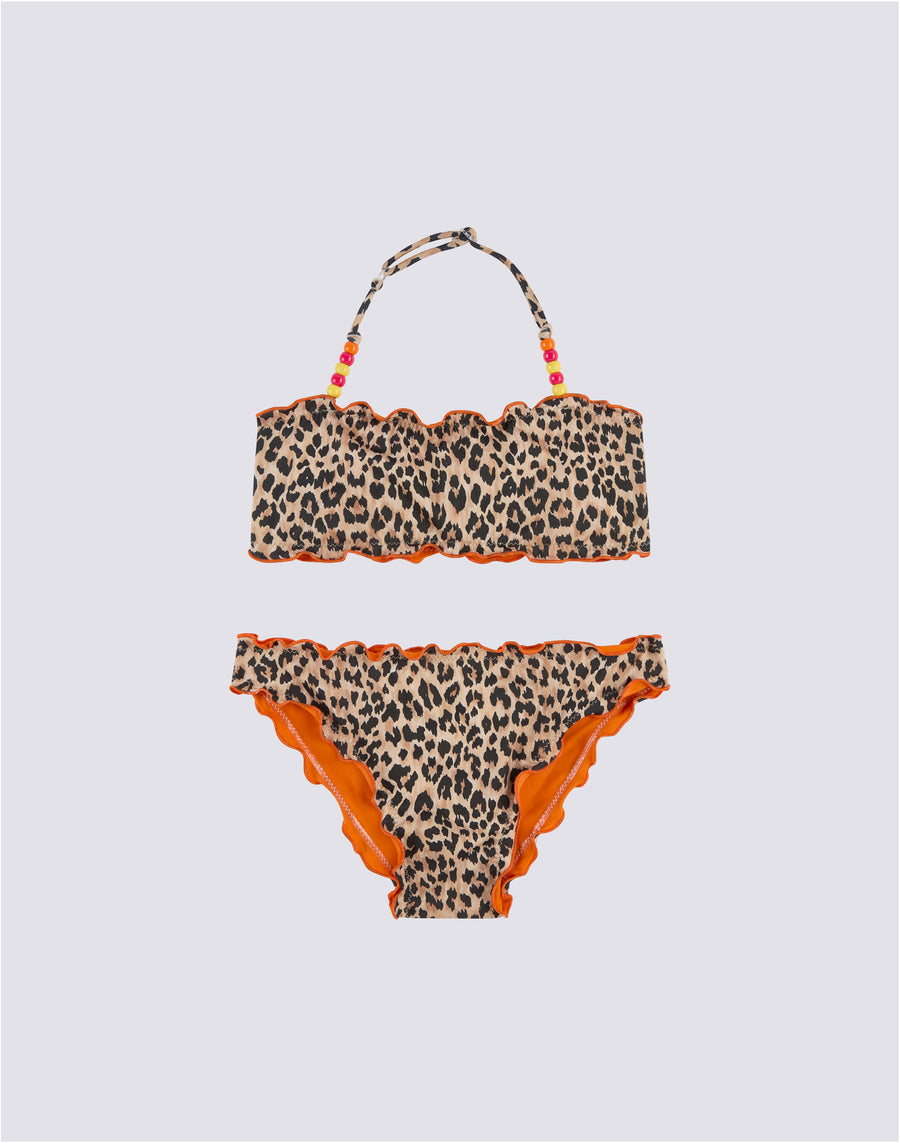 Mini bikini pour fille en imprimé Sweet Leopard composé d'une culotte froncée à taille fixe et d'un haut bandeau froncé avec perles multicolores.