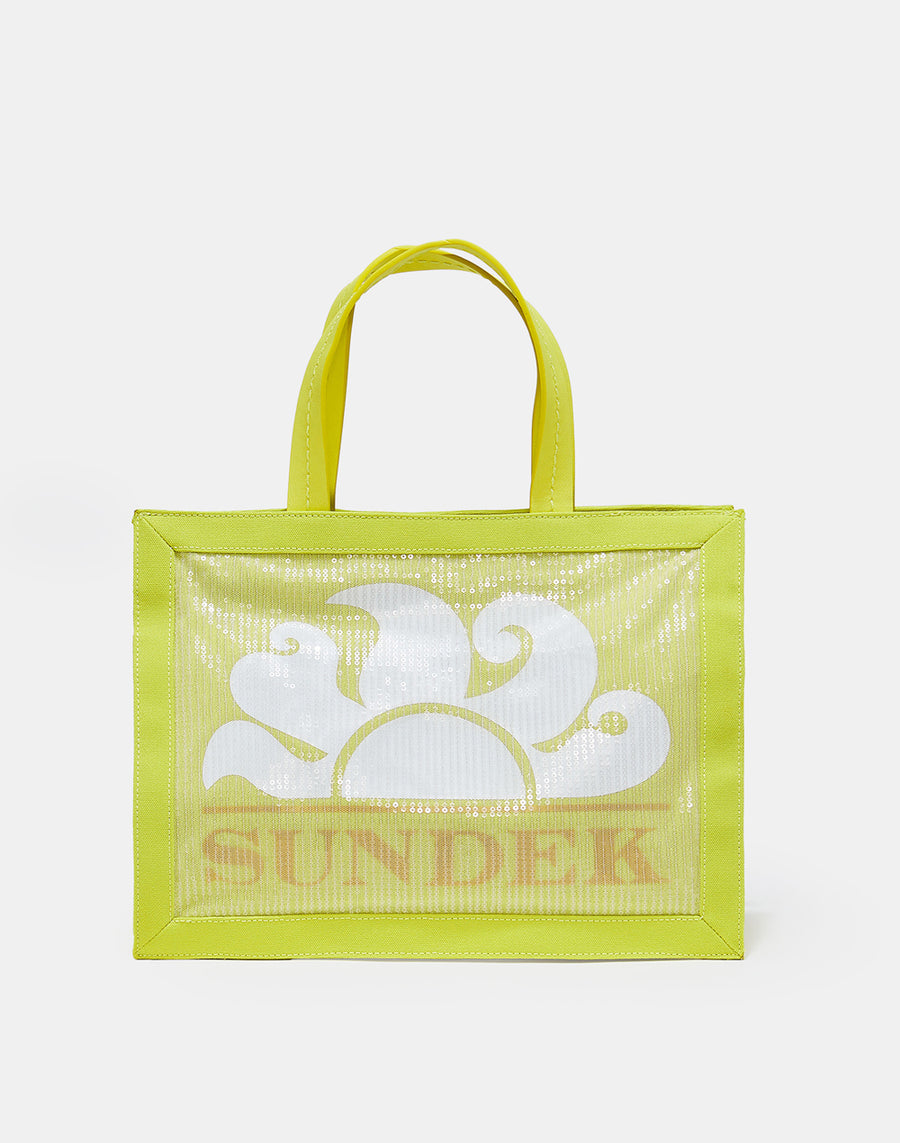 Sac en mesh de taille moyenne avec détails en sequins et logo Sundek imprimé. Ce sac est parfait pour la plage grâce à son filet à mailles fines qui empêche le passage du sable. Avec charm en forme de planche de surf.