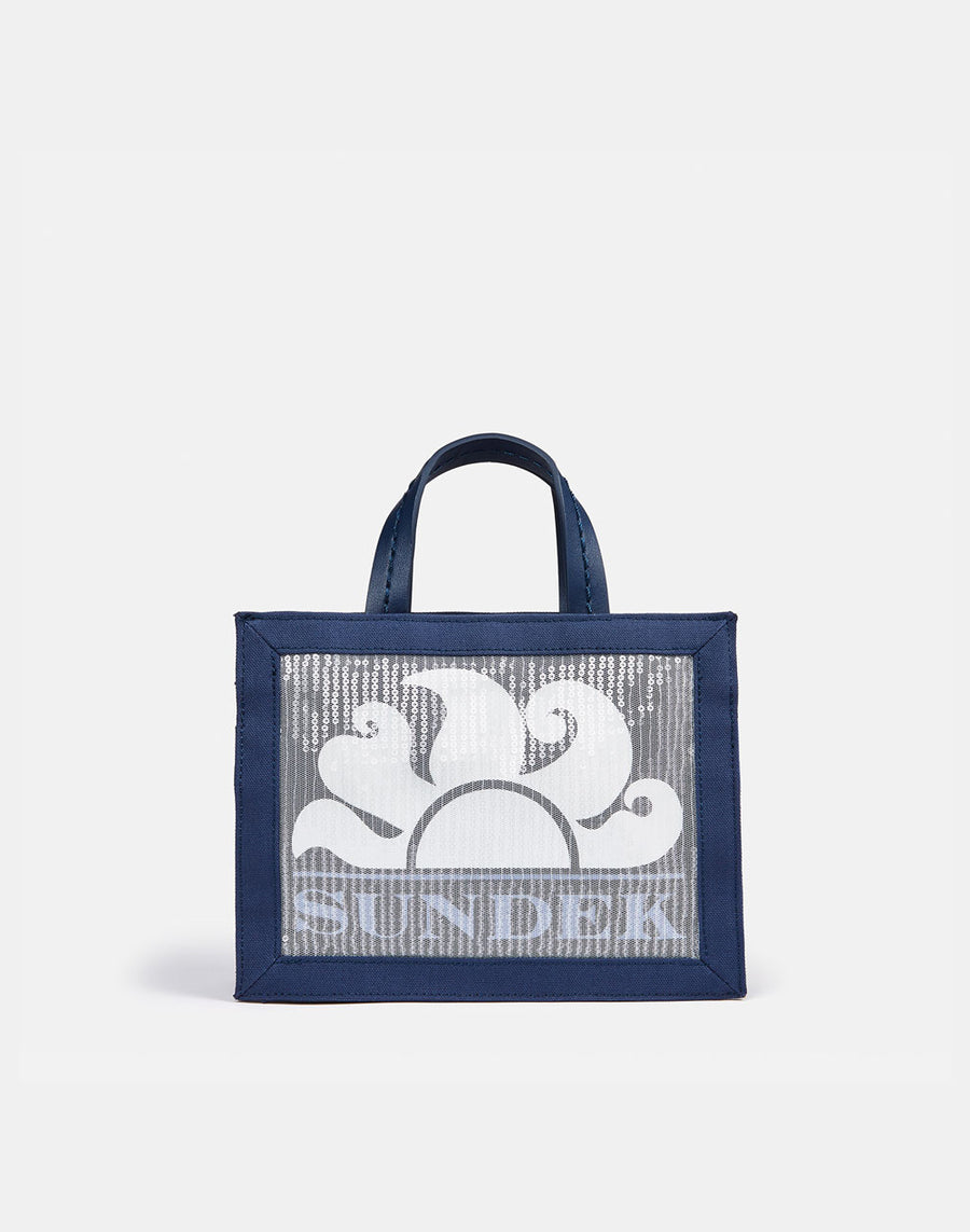 Petit sac en mesh avec détails en sequins et logo Sundek imprimé. Ce sac est parfait pour la plage grâce à son filet à mailles fines qui empêche le passage du sable.