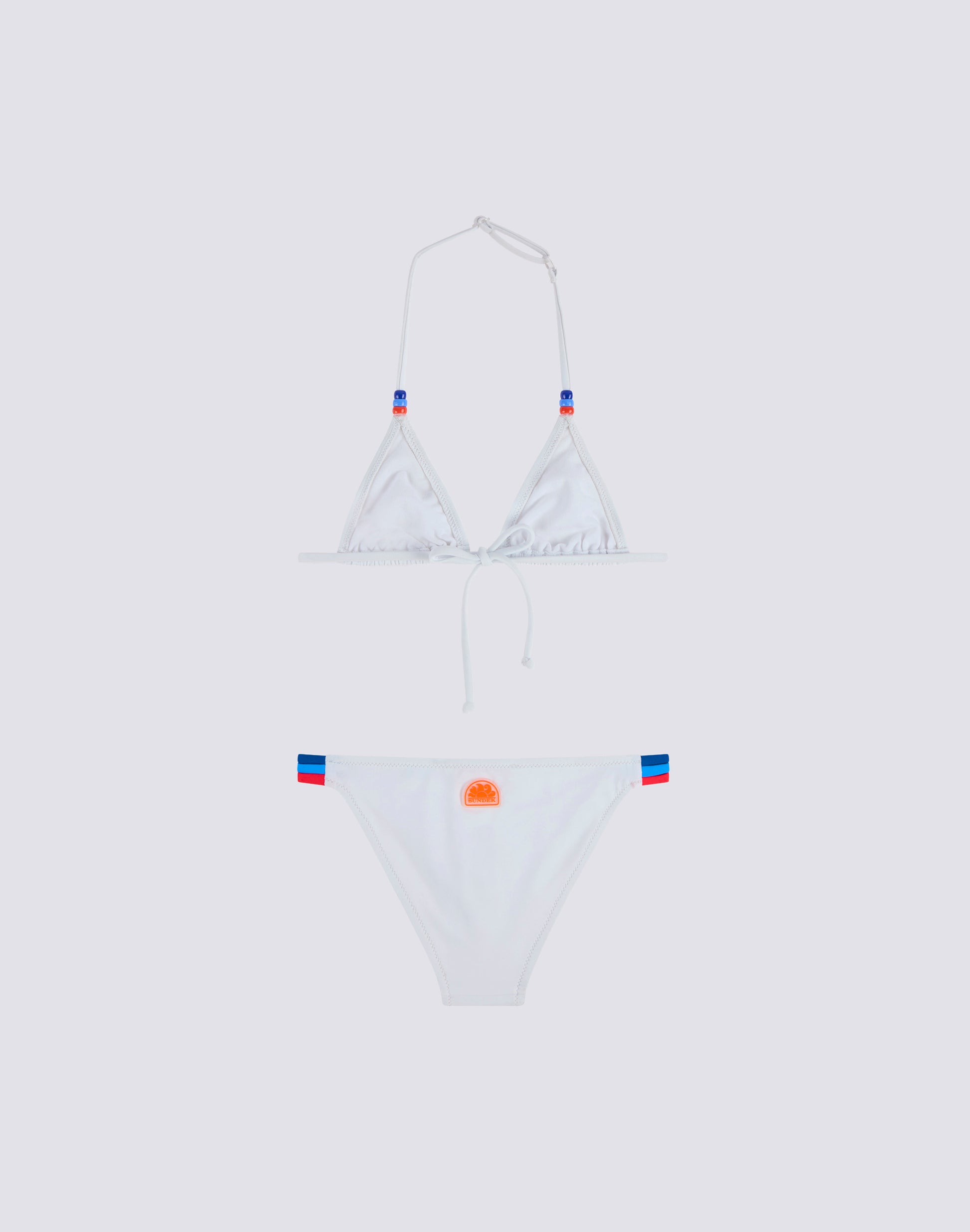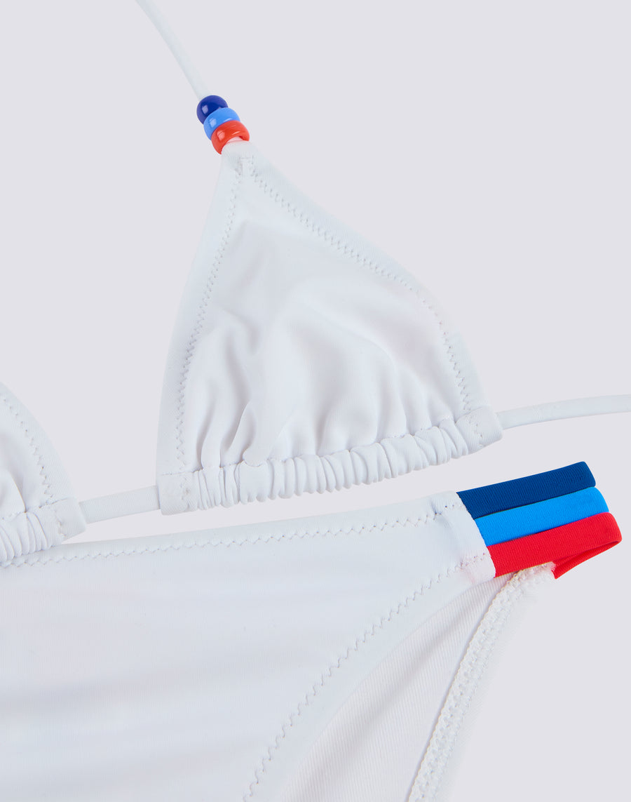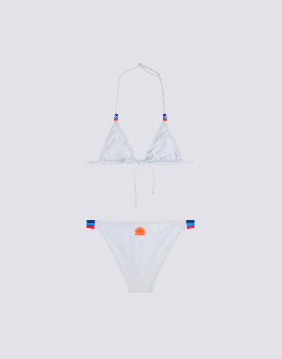 Bikini de plage pour fille avec haut triangle réglable par des lacets derrière le cou, ornés de perles tricolores. Les trois couleurs des perles sont reprises sur le détail tricolore sur le côté du slip. Les deux pièces du maillot sont réalisées en tissu VITA by Carvico, confortable, résistant et insensible au chlore et aux crèmes solaires.