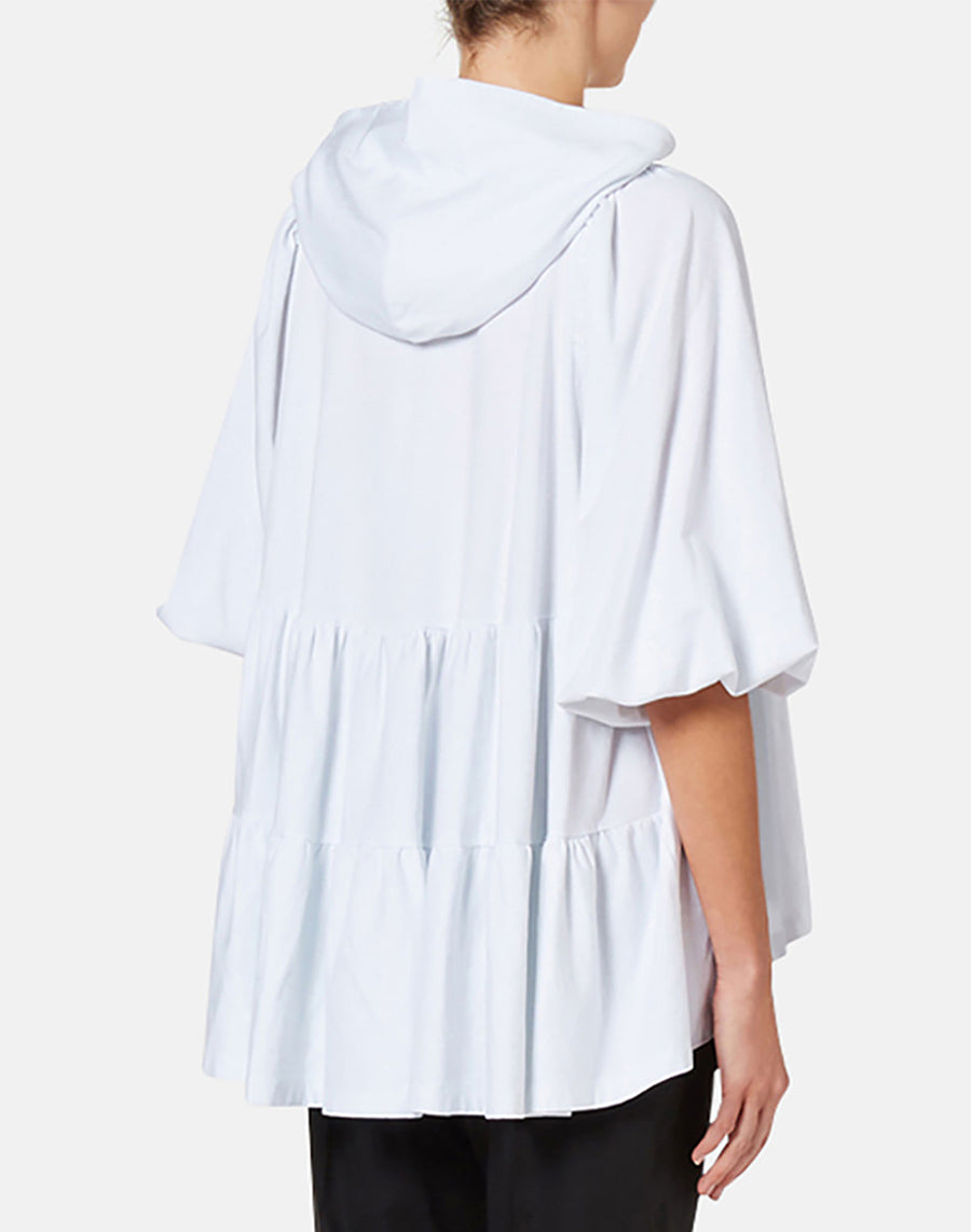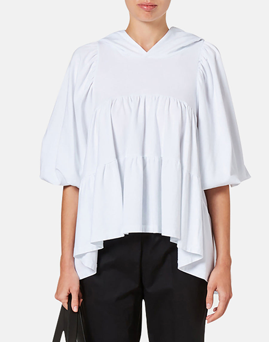 Easywear féminin avec ce sweat-shirt en jersey de coton stretch à volants et col à capuche. À porter avec un jean, un short ou un pantalon