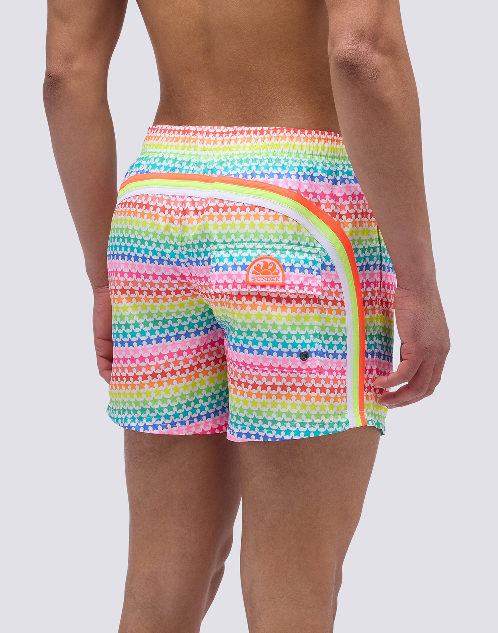 Maillot de bain pour homme en tissu polyester léger et à séchage rapide. Détail arc-en-ciel emblématique Sundek au dos et imprimé. Longueur extérieure de la cuisse 14”/35 CM (en taille M).