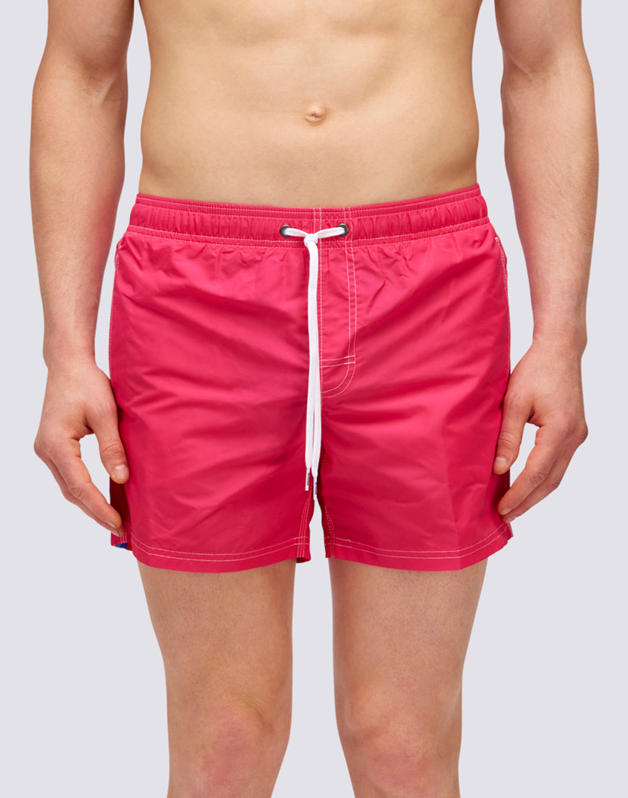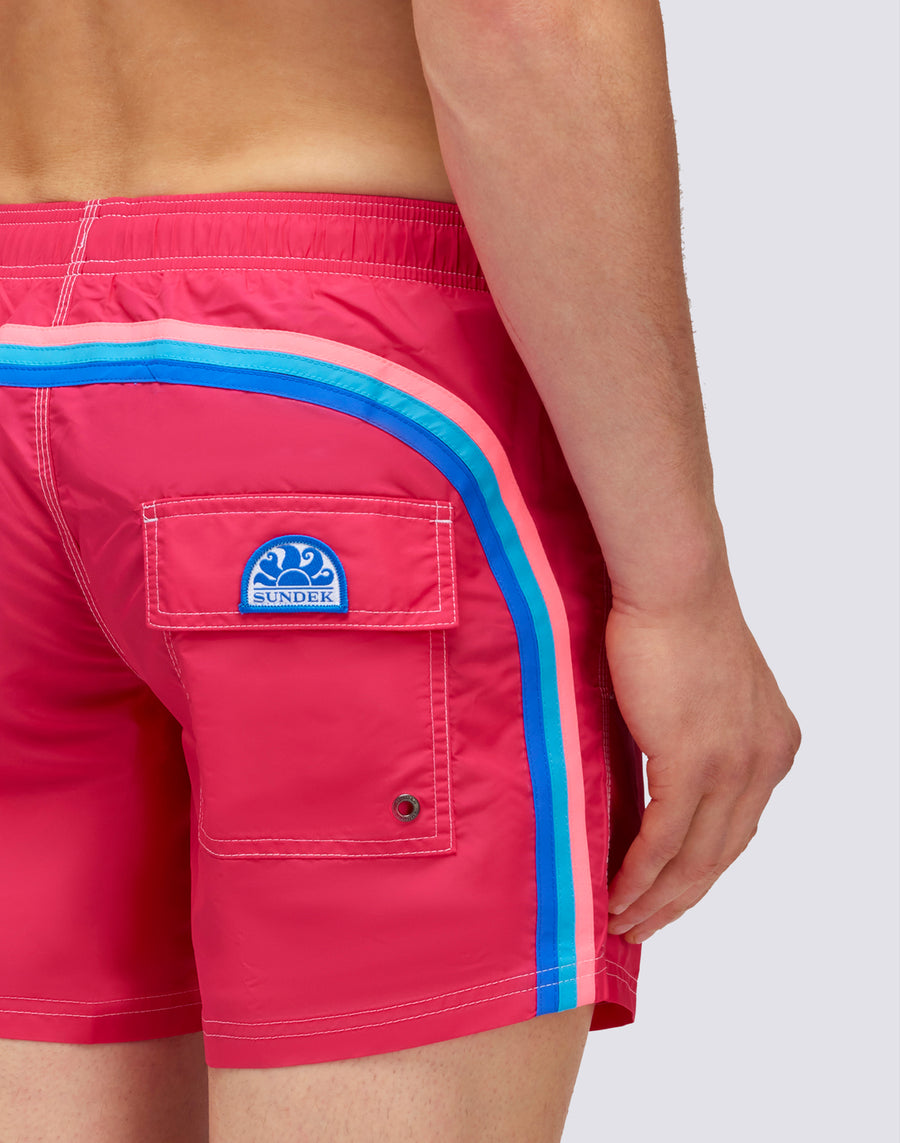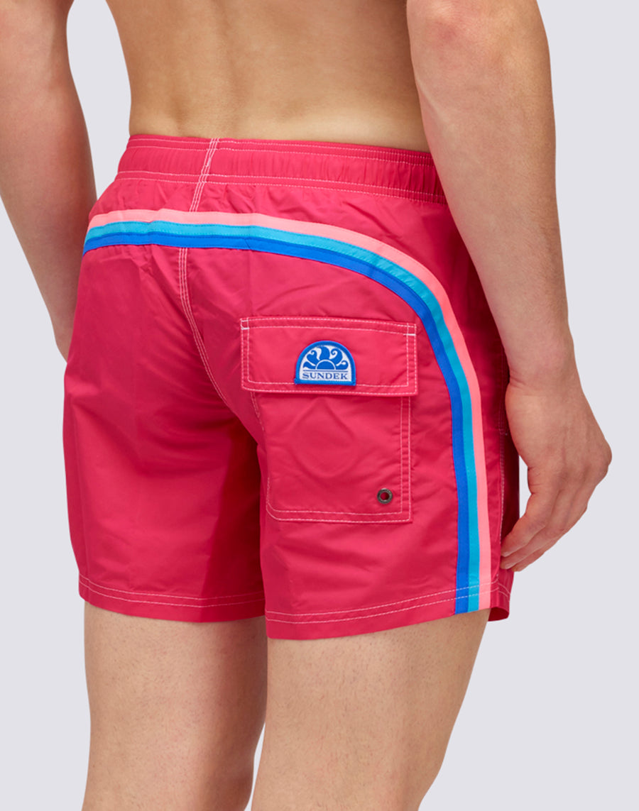 Short de bain court pour homme avec taille élastiquée, cordon de serrage et arc-en-ciel emblématique Sundek dans le dos. Ce maillot de bain est réalisé avec des coutures à trois aiguilles et 100% de notre tissu historique, le nylon-taffetas : doux comme de la soie, léger et résistant à tout, il sèche très rapidement pour vous offrir un confort partout, dans les vagues et en dehors des cascades. Longueur 35 cm (taille M), mesurée à l'extérieur de la jambe.