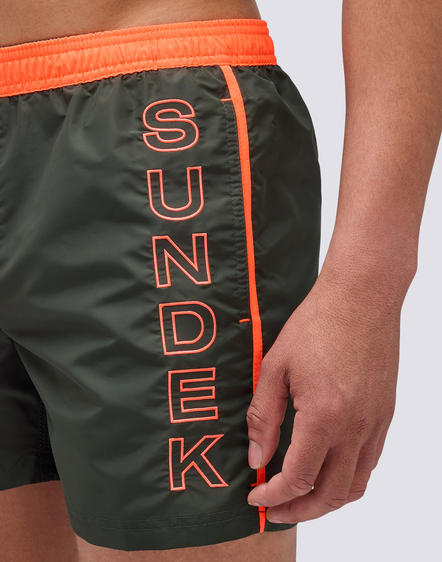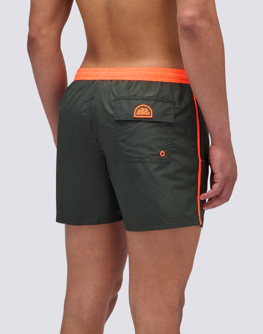 MAILLOT DE BAIN COURT À TAILLE ÉLASTIQUÉE EN TAFFETAS ICONIQUE AVEC PASSEPOILS CONTRASTÉS