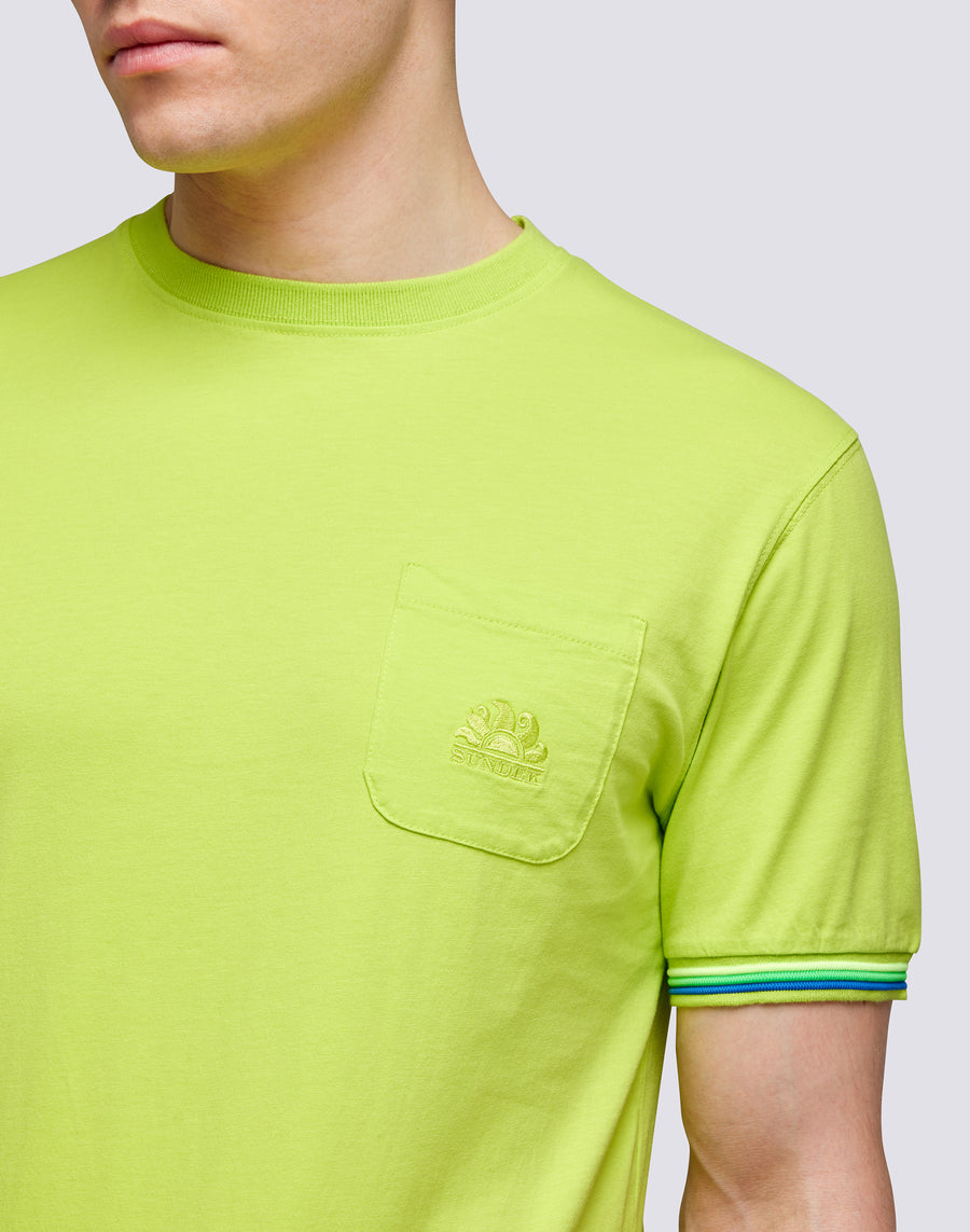 T-shirt de sport de couleur unie avec le tricolore particulier au bas de la manche : un choix de caractère pour accompagner chaque tenue décontractée. Un t-shirt adapté pour compléter n'importe quel look décontracté, parfait à la plage avec un boardshort et à tout autre moment. du jour avec des pantalons longs et des shorts.