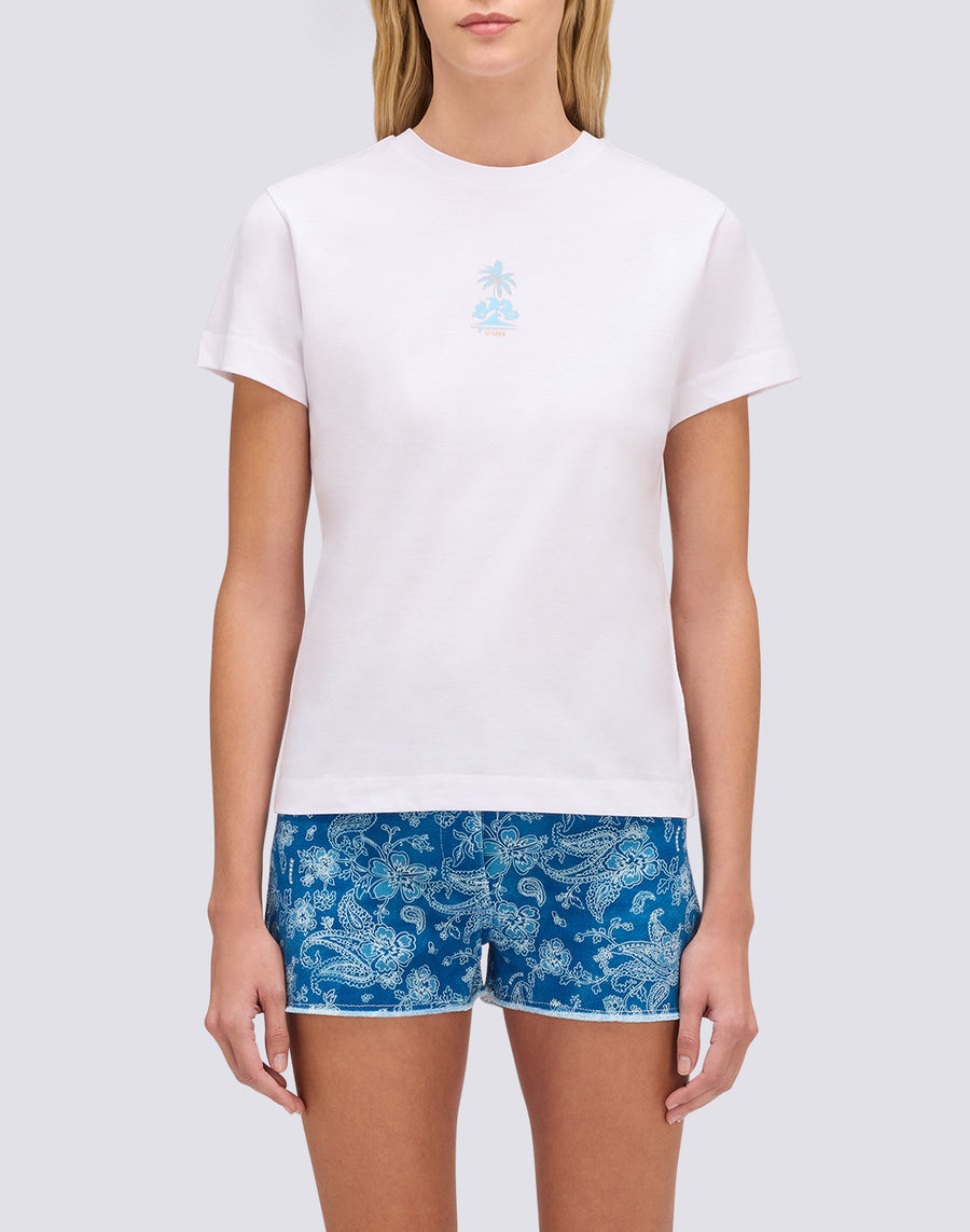 T-shirt femme à col rond souple avec imprimé GOOD VIBES ONLY et palmier brodé sur le devant. Un vêtement basique et polyvalent à porter seul ou associé à d'autres pièces de la collection.