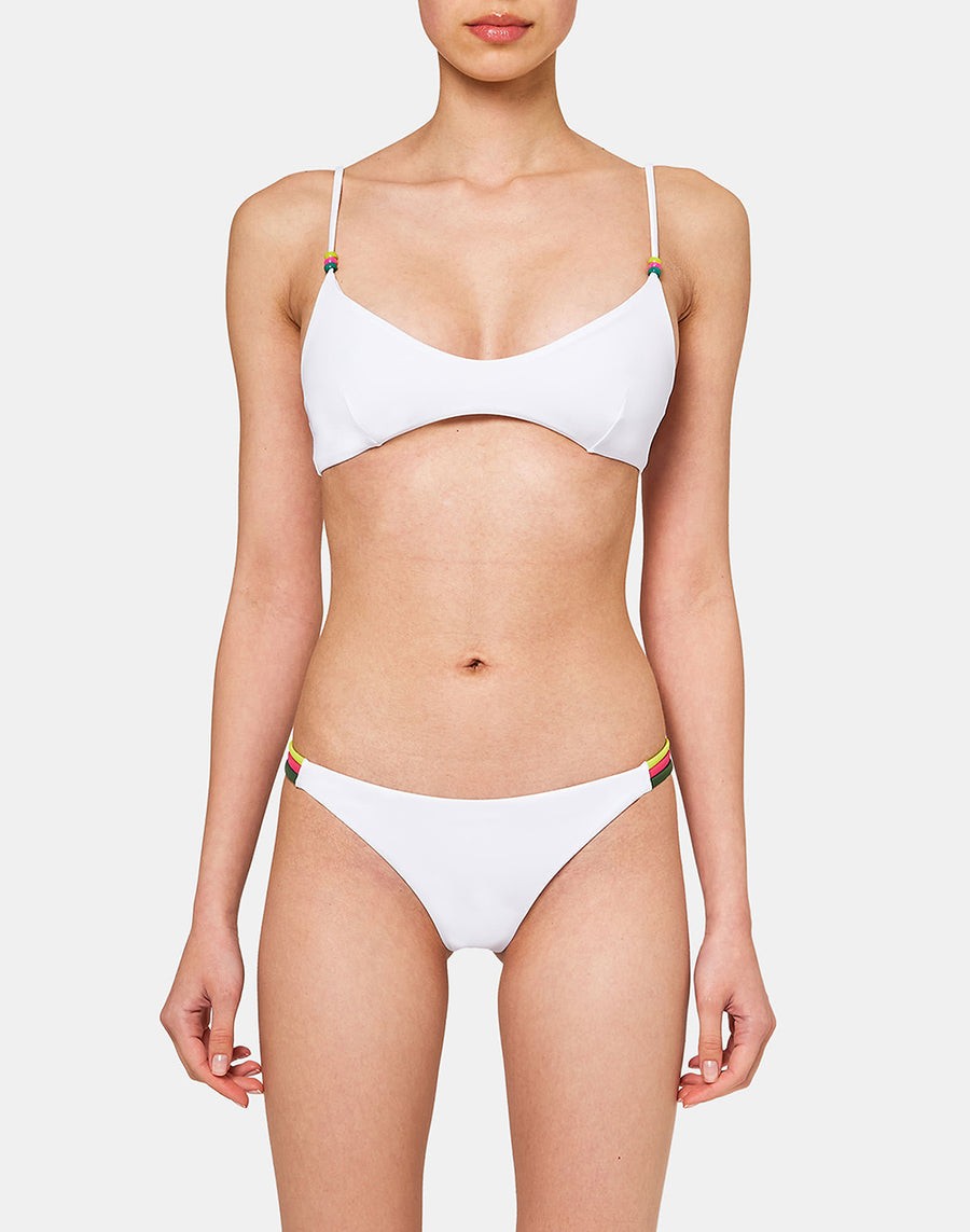 Si tu aimes les modèles branchés, tu pourras compter sur ce bikini composé d'un haut brassière avec rembourrage et perles multicolores et du slip brésilien avec bandes tricolores sur les hanches.
