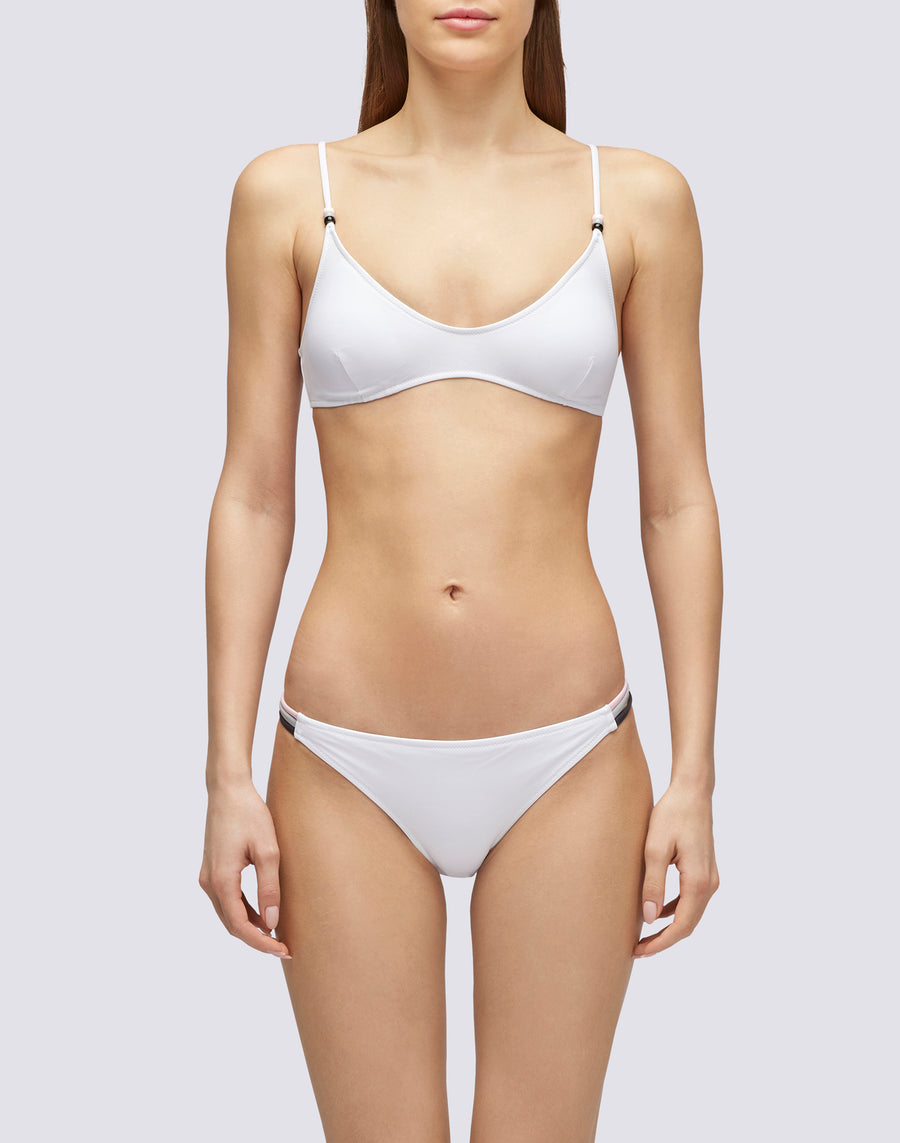 Si tu aimes les modèles branchés, tu pourras compter sur ce bikini composé d'un haut brassière avec rembourrage et perles multicolores et du slip brésilien avec bandes tricolores sur les hanches.