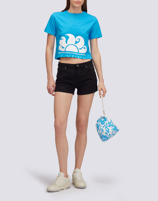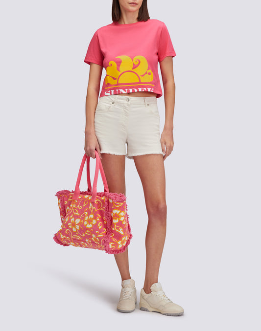 T-SHIRT A MEZZE MANICHE IN LINO CON STAMPA FLEUR DE JOIE
