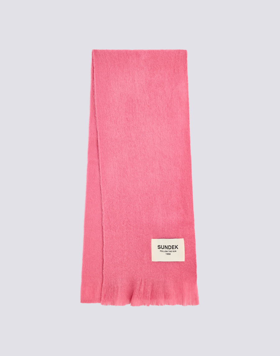 Sciarpa a tinta unita, etichetta logo grande e mini frange, l'accessorio must-have per le giornate invernali.