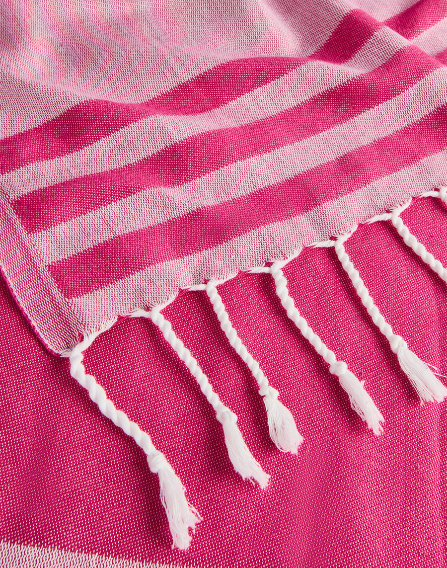 Telo mare fouta jacquard con maxi logo a contrasto con righe verticali e fondi con frange intrecciate. Lunghezza: 100x170 cm. Peso: 320 gr.