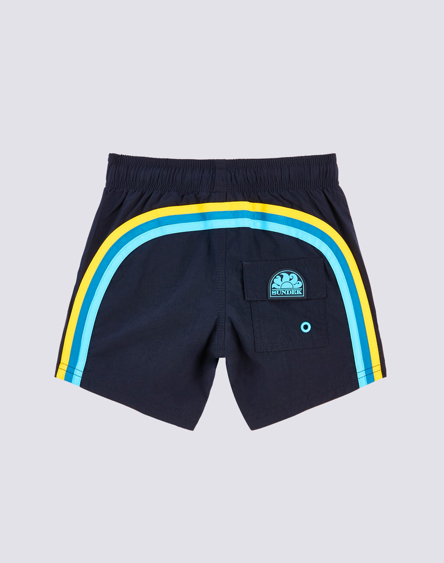 Colore intenso e tessuto iper-confortevole ad asciugatura rapida per questi pantaloncini mare bimbo. Un modello che accompagnerà il tuo bimbo nelle sue mille attività in vacanza, perfetto per muoversi e giocare in piena libertà. è realizzato nel nostro tessuto storico nylon-taffetà e costruito con cuciture a tre aghi che lo rendono resistente nel tempo. Da mettere in valigia, anno dopo anno.