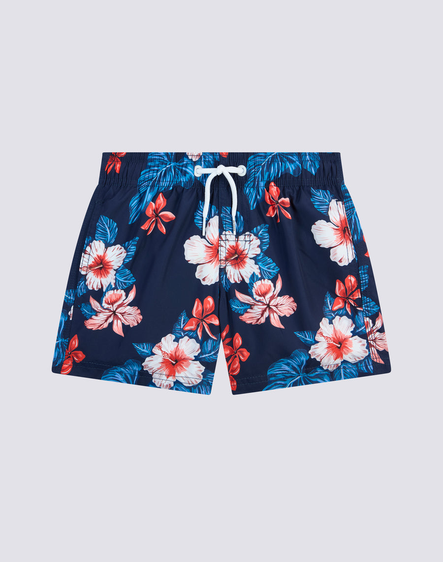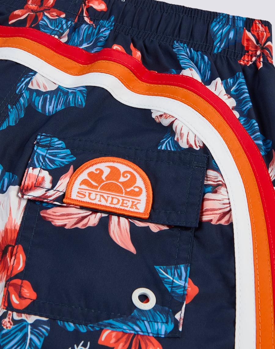 Costume da bagno con coulisse elastica in vita, in leggero tessuto Repreve® riciclato da bottiglie di plastica. Con stampa floreale Heaven dream e il tradizionale arcobaleno Sundek sul back. Lunghezza esterno coscia 10.25"/26 cm (taglia 6anni).
