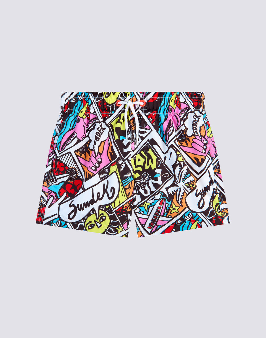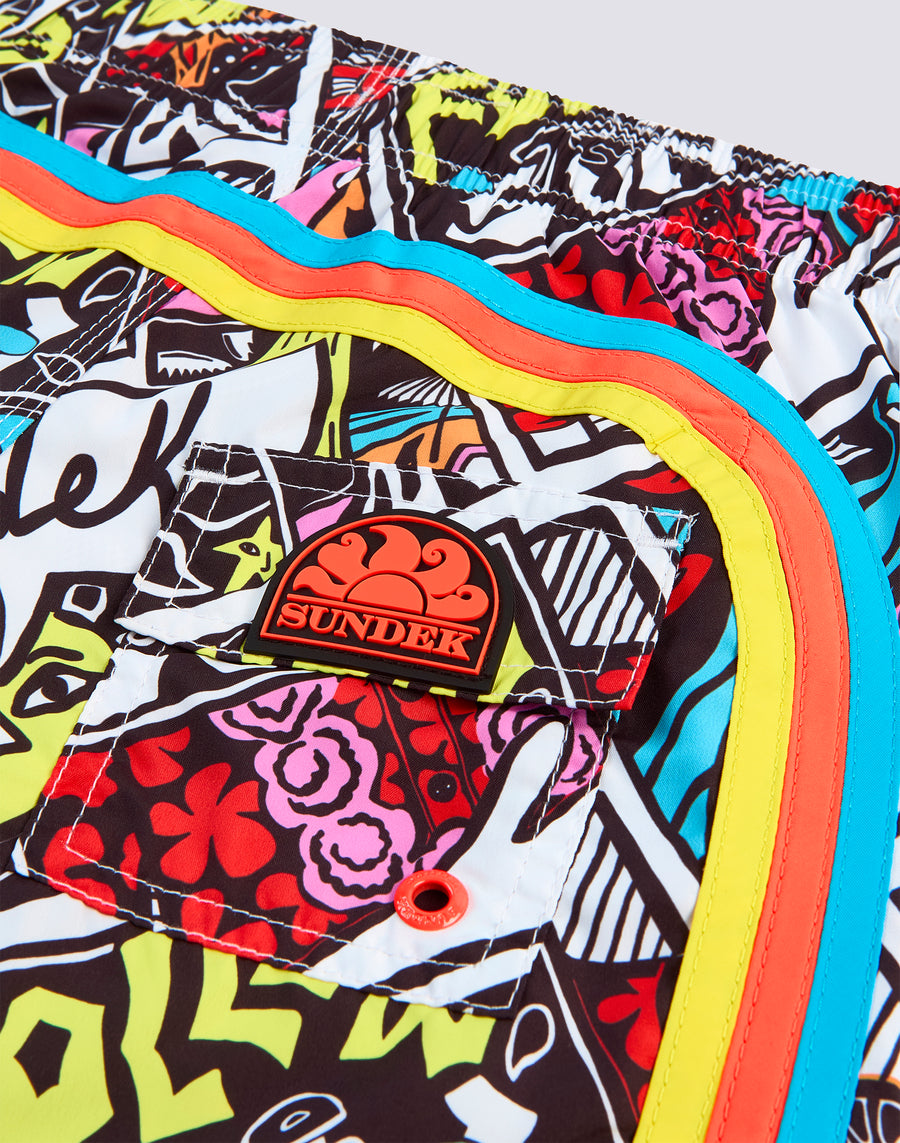 Costume da bagno con coulisse elastica in vita, in leggero tessuto Repreve® riciclato da bottiglie di plastica. Con stampa Fumetto e il tradizionale arcobaleno Sundek sul back. Lunghezza esterno coscia 10.25"/26 cm (in taglia 6 anni).