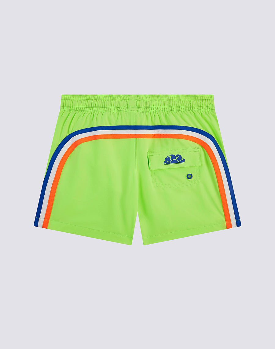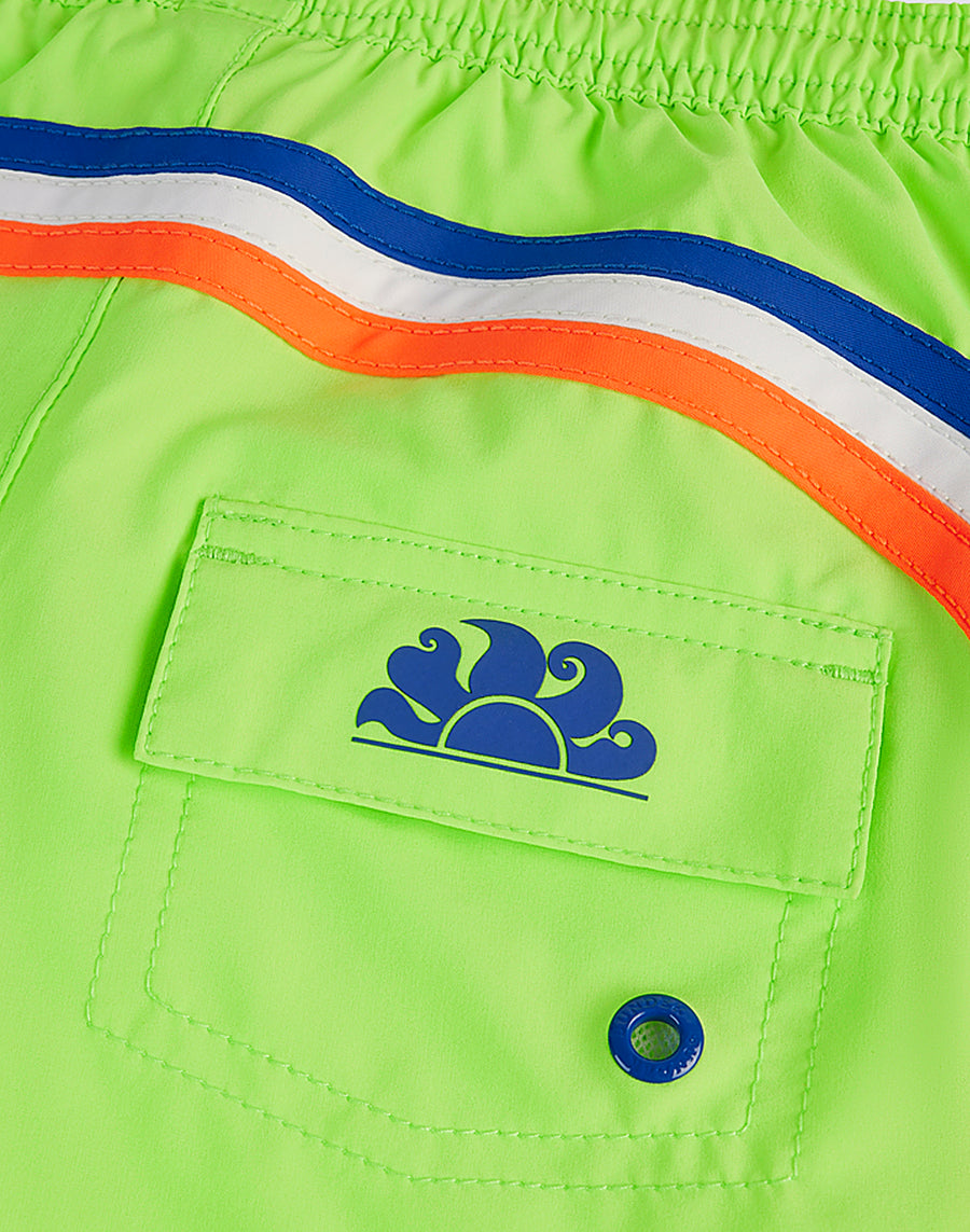 Colore intenso e tessuto iper-confortevole ad asciugatura rapida per questi pantaloncini mare bimbo. Un modello che accompagnerà il tuo bimbo nelle sue mille attività in vacanza, perfetto per muoversi e giocare in piena libertà. Leggero, resistente, si asciuga rapidissimo ed è realizzato in tessuto 4 Way Stretch. Ha le nostre classiche cuciture a tre aghi che aumentano la resistenza nel tempo e il nostro arcobaleno iconico sul retro.
